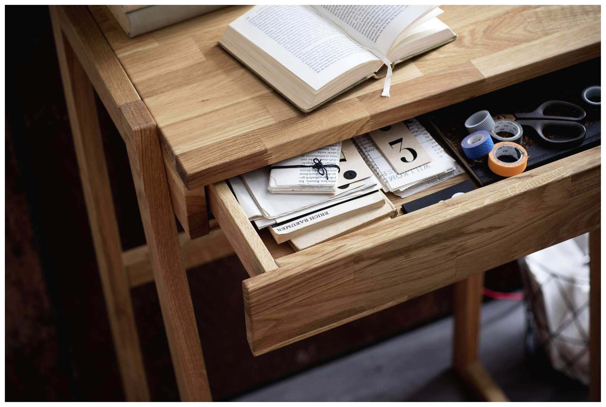 Das Pult bietet eine angenehme Abwechslung für alle Schreibtischtäter. Wer viel sitzt, muss sich ab und zu bewegen oder einmal aufstehen. Dabei kann manche Arbeit problemlos fortgeführt werden. Die Konsole nimmt nur wenig Raum ein, bietet aber unter anderem genügend Platz für Korrekturarbeiten oder Leseerlebnisse. Sie ist sogar groß genug, um eine kleine Tischlampe aufzunehmen. Ansonsten empfiehlt sich eine Steh-Leselampe mit lesefreundlichem Licht. In der Schublade werden beispielsweise Stifte verstaut. Auf seinen trapezförmigen Beinen steht das Schreibpult ausgesprochen sicher. Auch zeigt es eine Holzverstärkung an der Rückseite der Beine.
