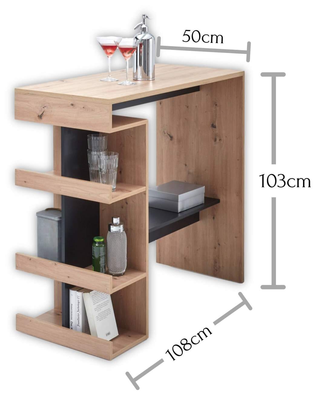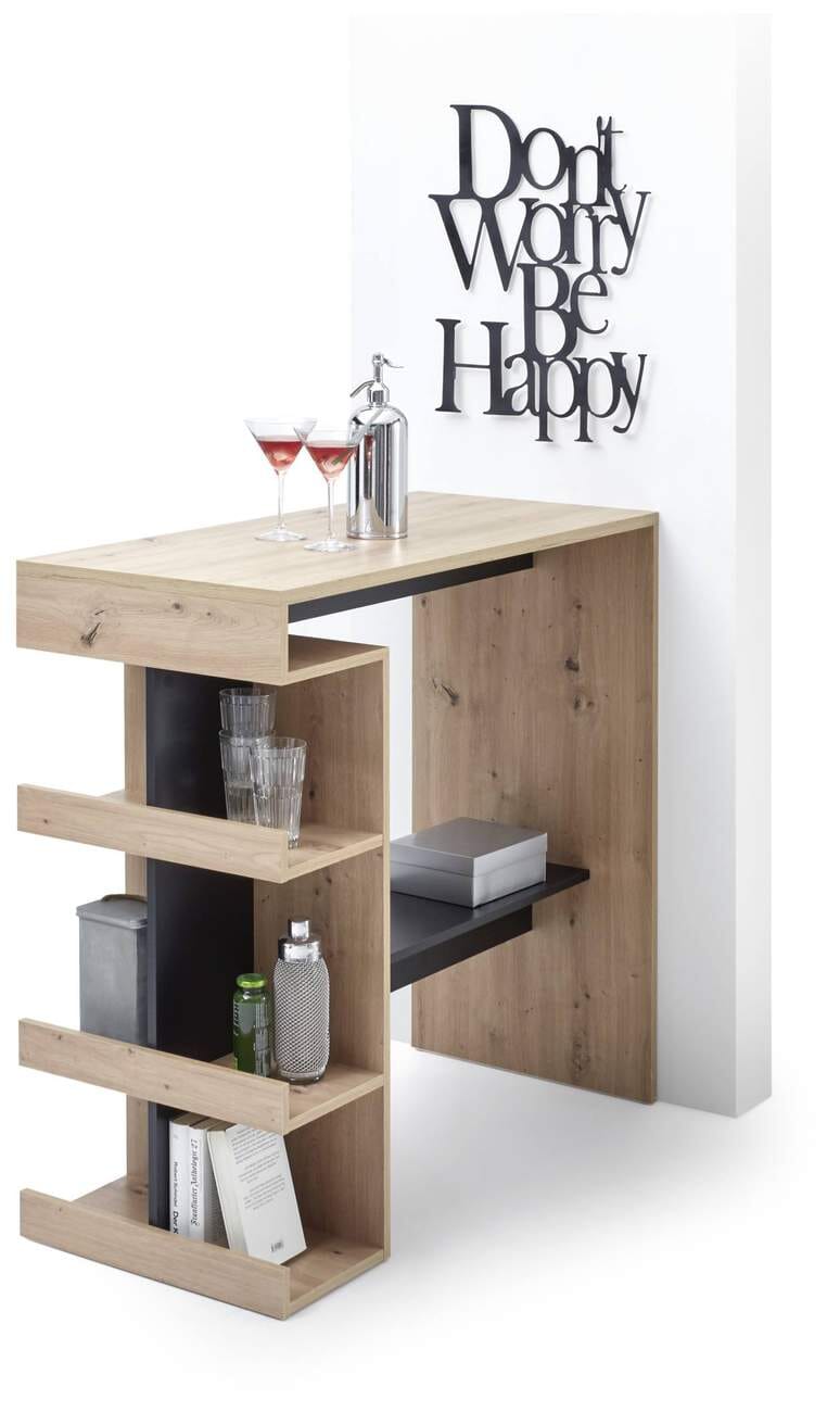 Der praktische und handliche Stehtisch Bartisch SMASH dient nicht nur im Partykeller oder in den Wohnräumen als eleganter Bartisch. Sie können den Tisch mit den vielen Ablageflächen auch in der Küche zum Einsatz bringen. Das geradlinige Design mit der Farbkombination aus feiner heller Eiche und mattem Schwarz passt in die unterschiedlichsten Einrichtungsstile.