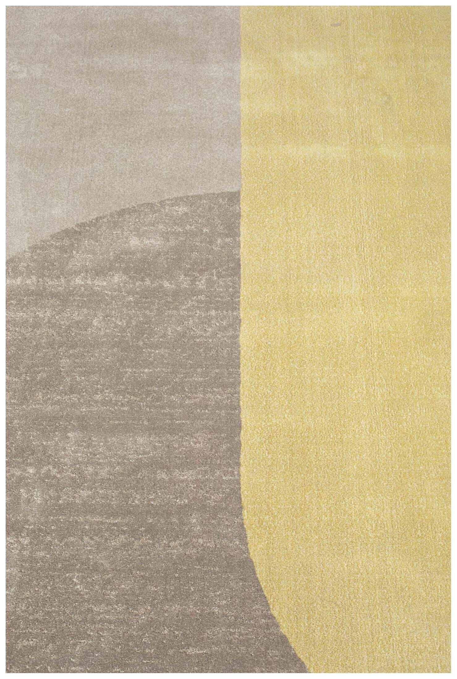 Durch seine geometrischen Muster in den Farben grau und gelb hat der Teppich ein modernes Design und passt sehr gut in geschmackvoll eingerichtete Wohnzimmer vor eine Polstergarnitur.