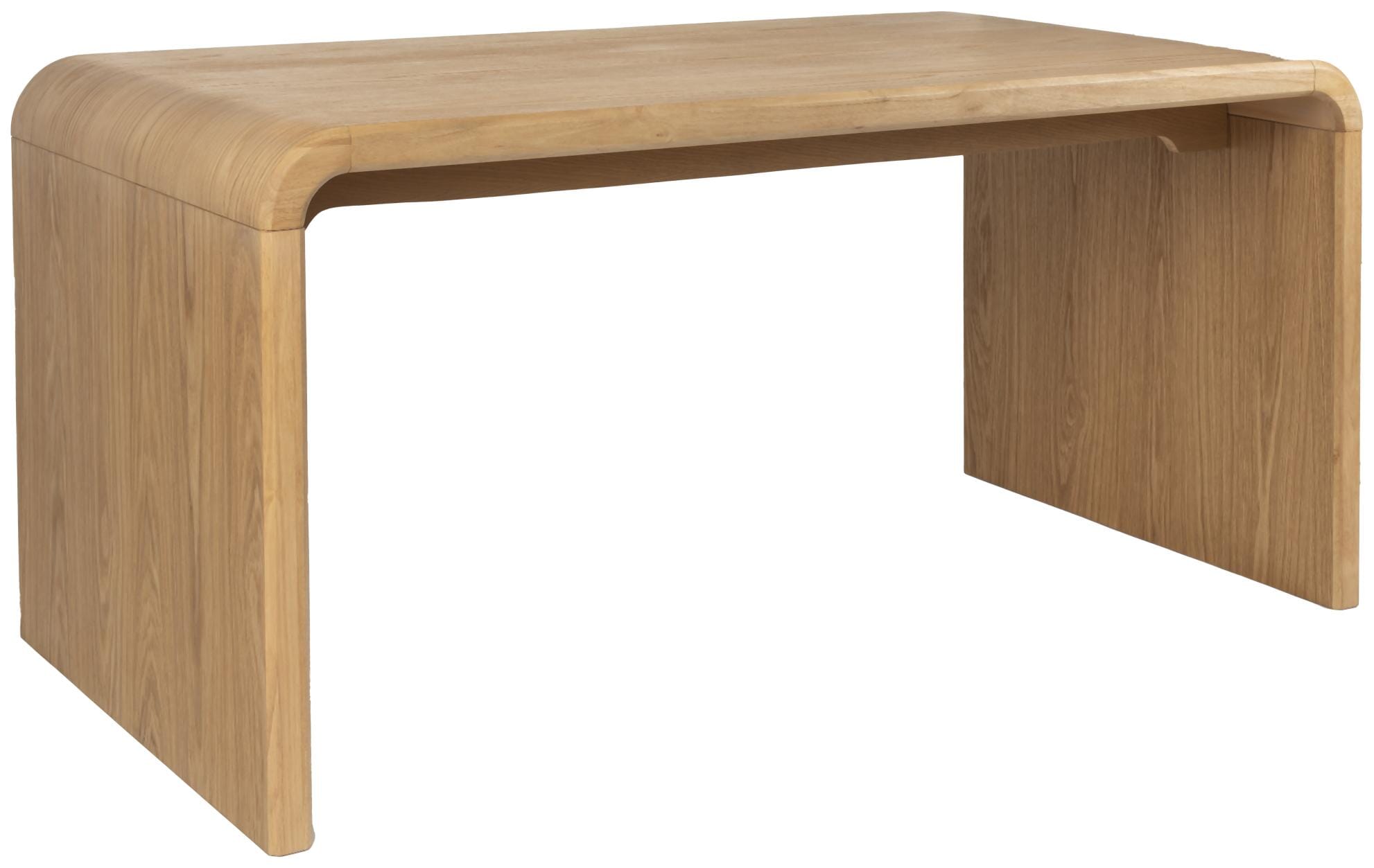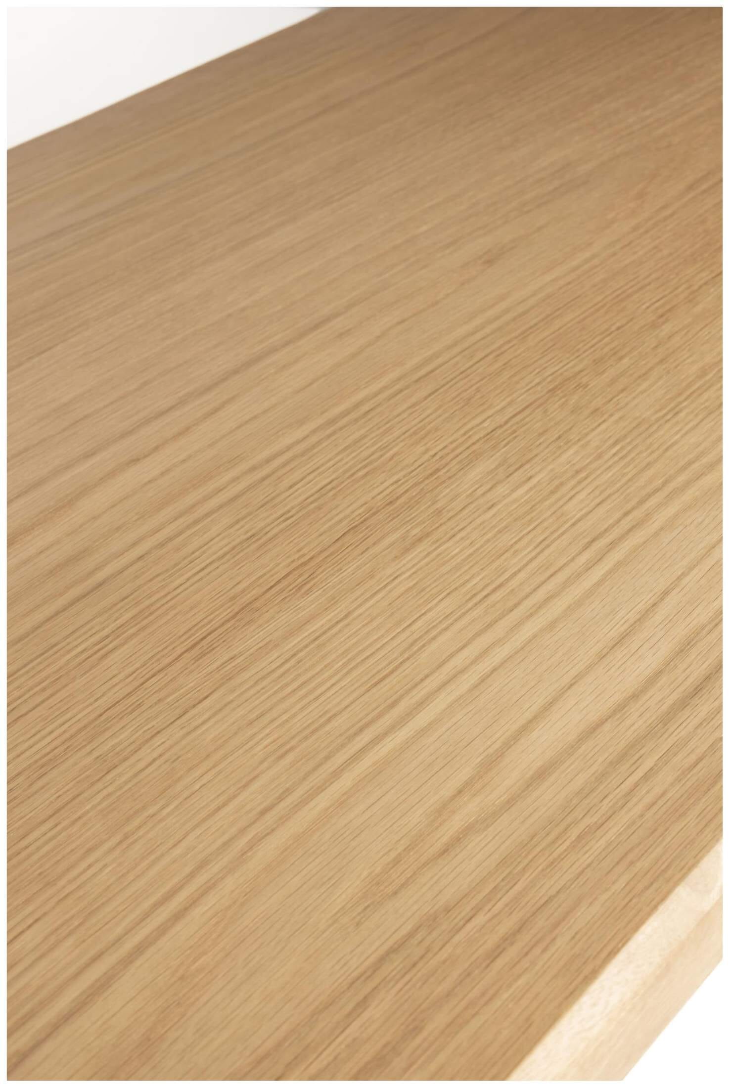 Der Tisch wurde mit Sorgfalt und Präzision hergestellt und besteht aus einem MDF-Rahmen mit Eichenfurnier, Kanten aus massivem Gummibaumholz und einer Natürlichen Nitrozellulose-Lackierung.