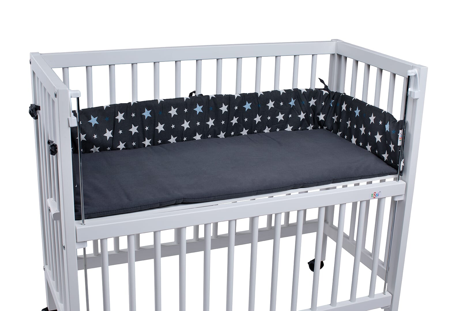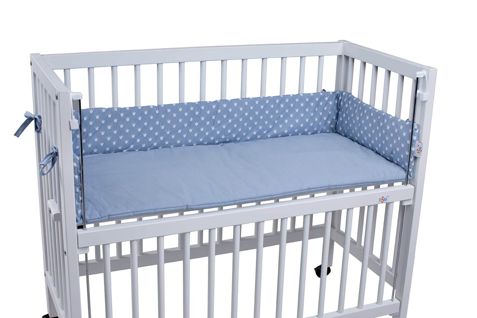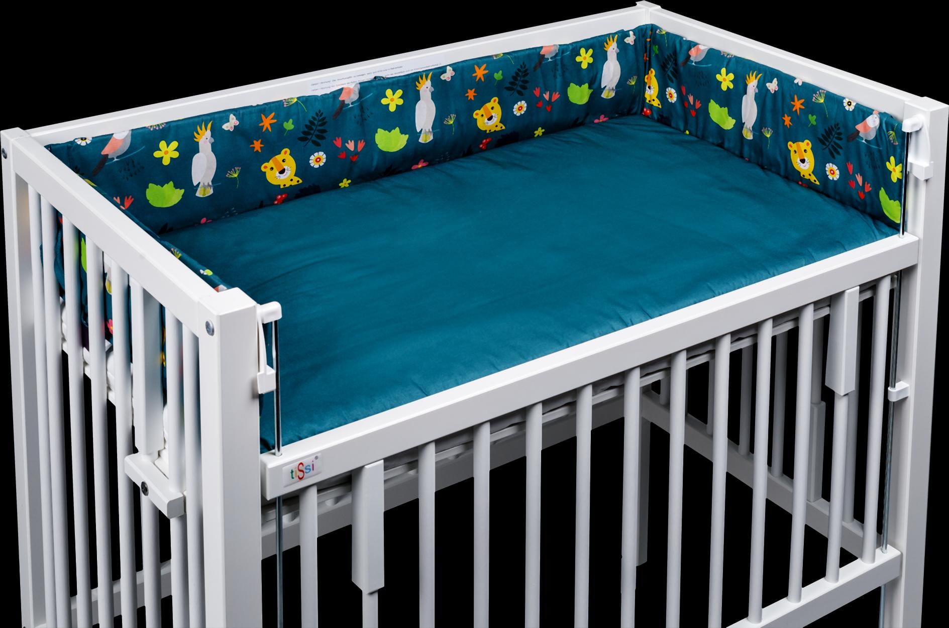 Die kuschelige Einlage aus natürlicher Baumwolle ist mit Polyester gefüllt und wird mit kleinen Bindebändchen an den Gitterstäben befestigt, damit es auch beim unruhigsten Schlaf. Sollte dabei mal ein kleines „Unglück“ passieren – kein Problem: Eventuelle Flecke verschwinden schnell wieder nach einem 30° C Waschgang in der Maschine.