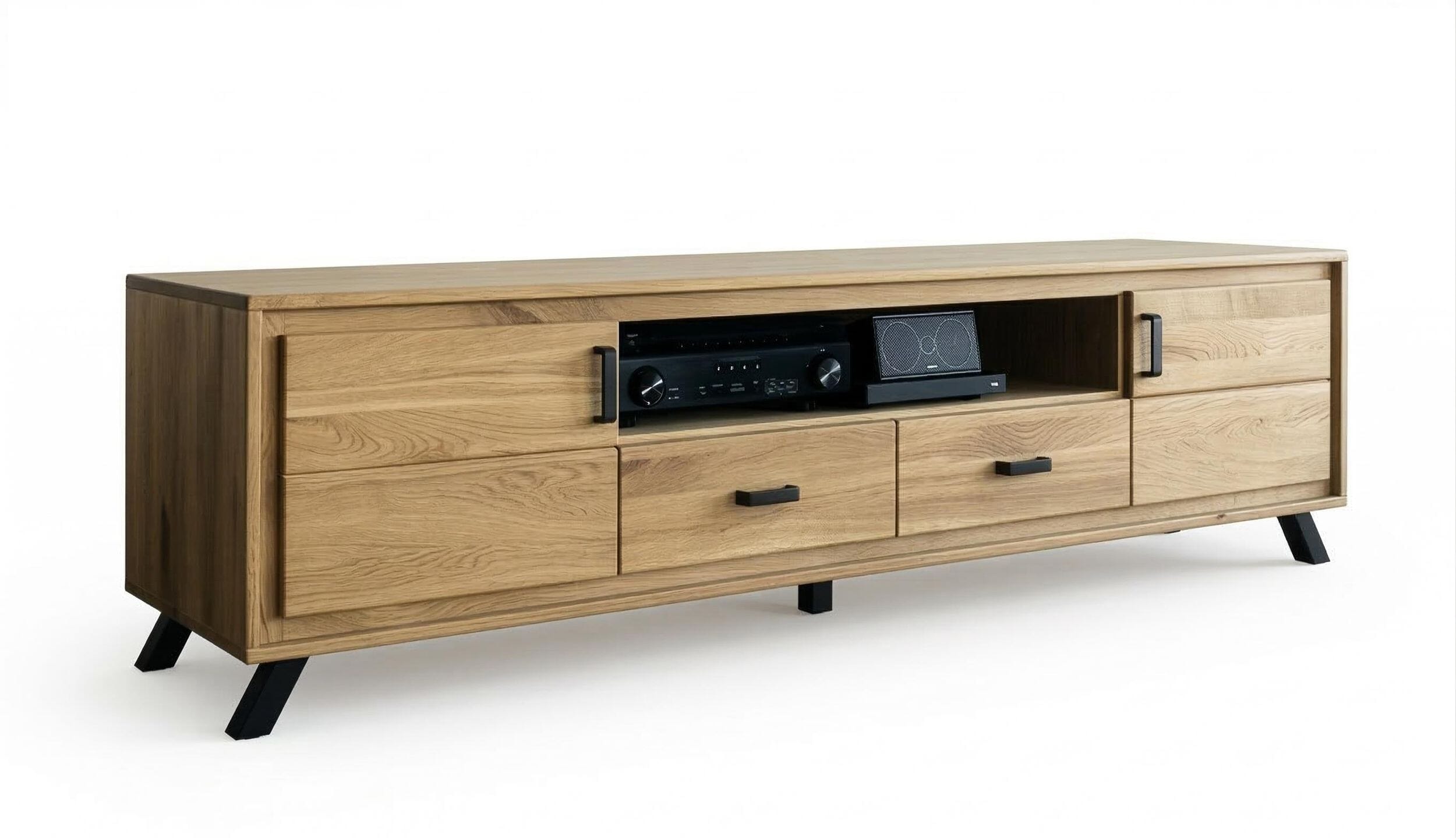 - Durchdachter Stauraum: Hinter zwei Türen, in zwei Schubladen und einem breiten, offenen Fach findet all deine Technik und Zubehör einen aufgeräumten Platz.