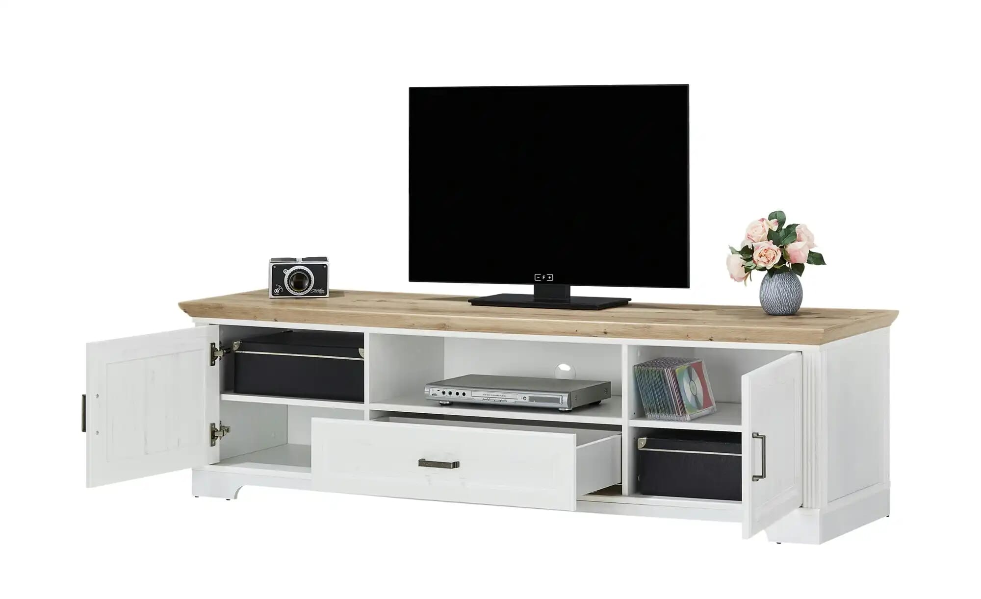 Dieses TV Lowboard ist raffiniert aufgebaut, und Sie haben die Wahl zwischen Offenheit und kleinen Geheimnissen