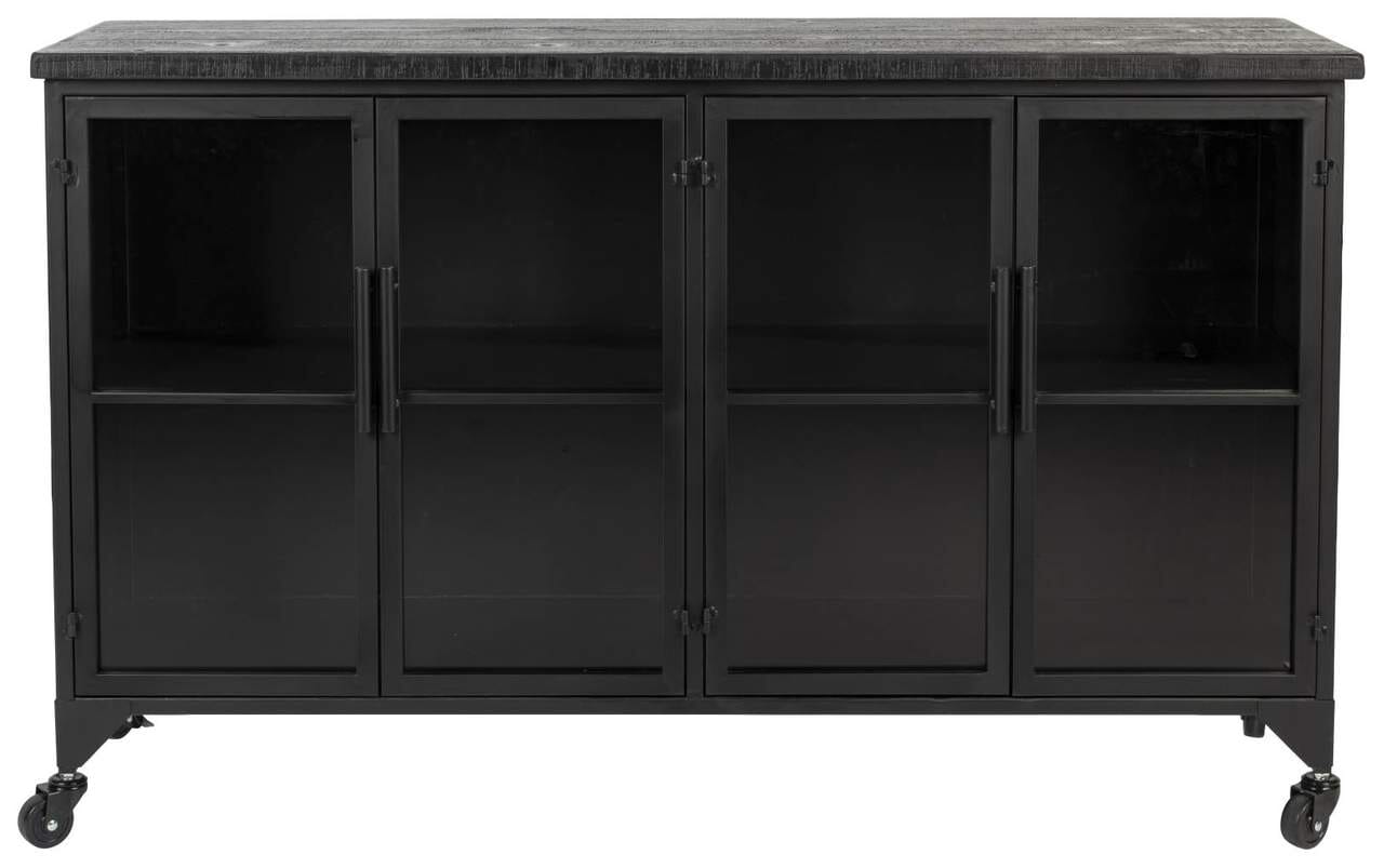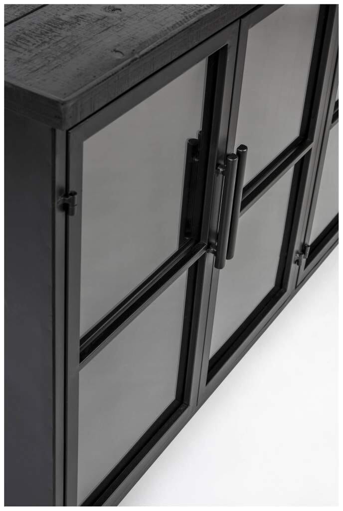 Der Rahmen der Vintage Vitrine Lowboard Kommode FERRE LOW besteht aus schwarz pulverbeschichtetem Stahl. Der Deckel aus MDF mit Tannenholzfurnier hat ein stilvolles Vintage Finish, das dem Möbel den typischen Look verleiht. Die Vitrine verfügt über einen festen Fachboden, sodass Sie auf zwei Ebenen Platz für verschiedene Dinge haben. Da sie Glastüren hat, ist ein Blick hinein jederzeit möglich.