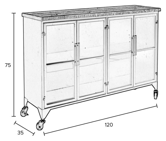 Die Vintage Vitrine Lowboard Kommode FERRE LOW besticht durch ihr einzigartiges Design. Das Möbelstück ist eine schöne Dekoration für Wohnräume oder das Büro und bietet Ihnen viel Stauraum.