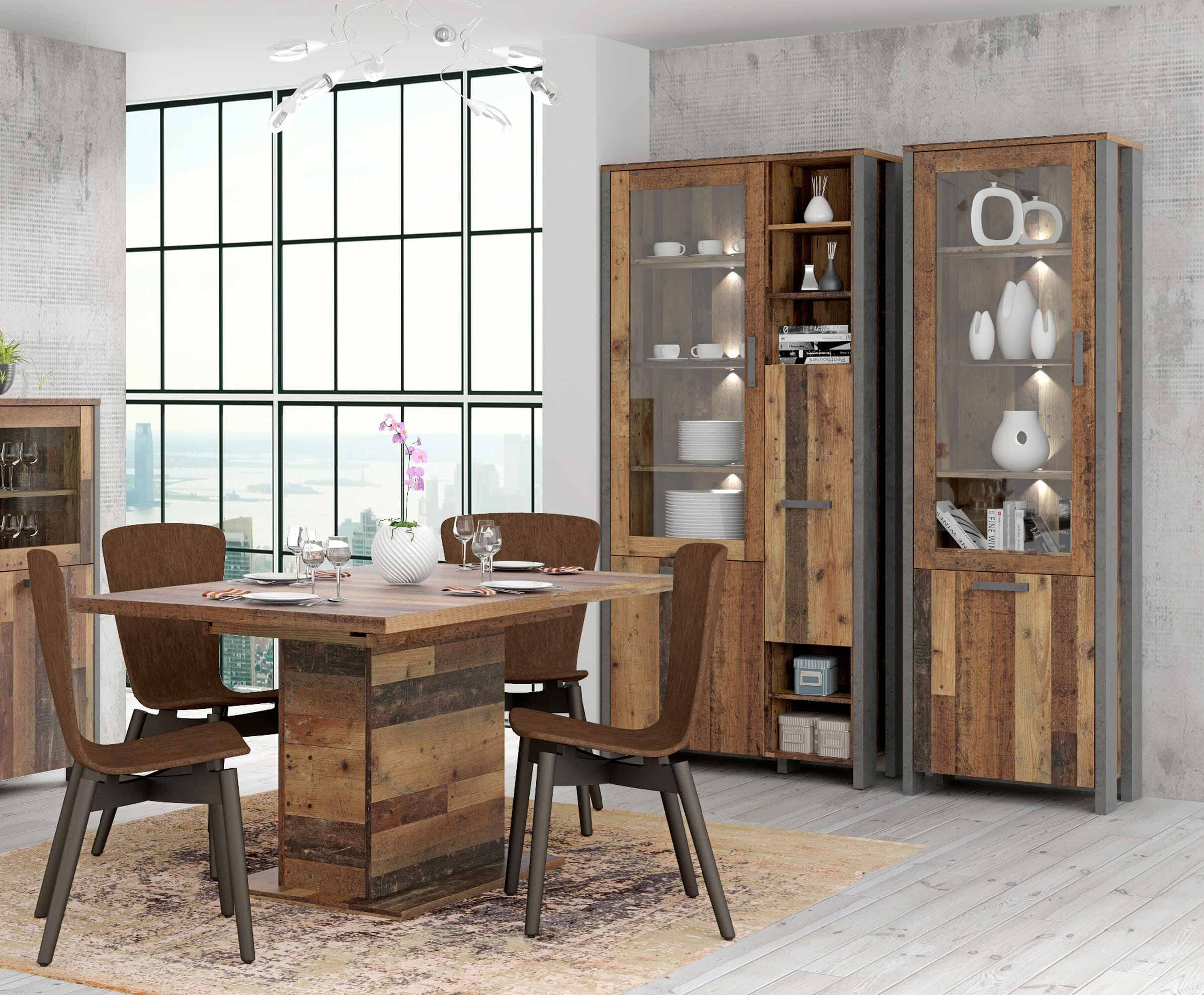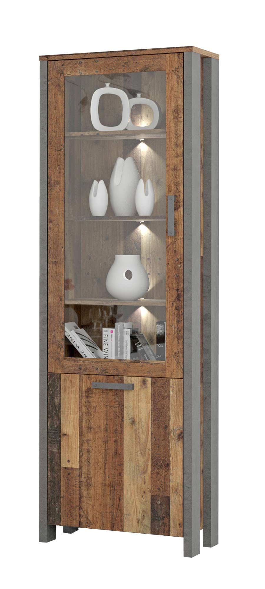 Der angesagte Kontrast aus Old Wood Vintage Optik und dem eher kühlen Betondekor ist so etwas wie ein Allrounder, der Gemüter jeder Art befriedigt. Cool? Ja, doch! Warm? Auch das! Alles zu seiner Zeit. Und viel Platz nimmt die hohe Vitrine auch nicht ein. Fein.
