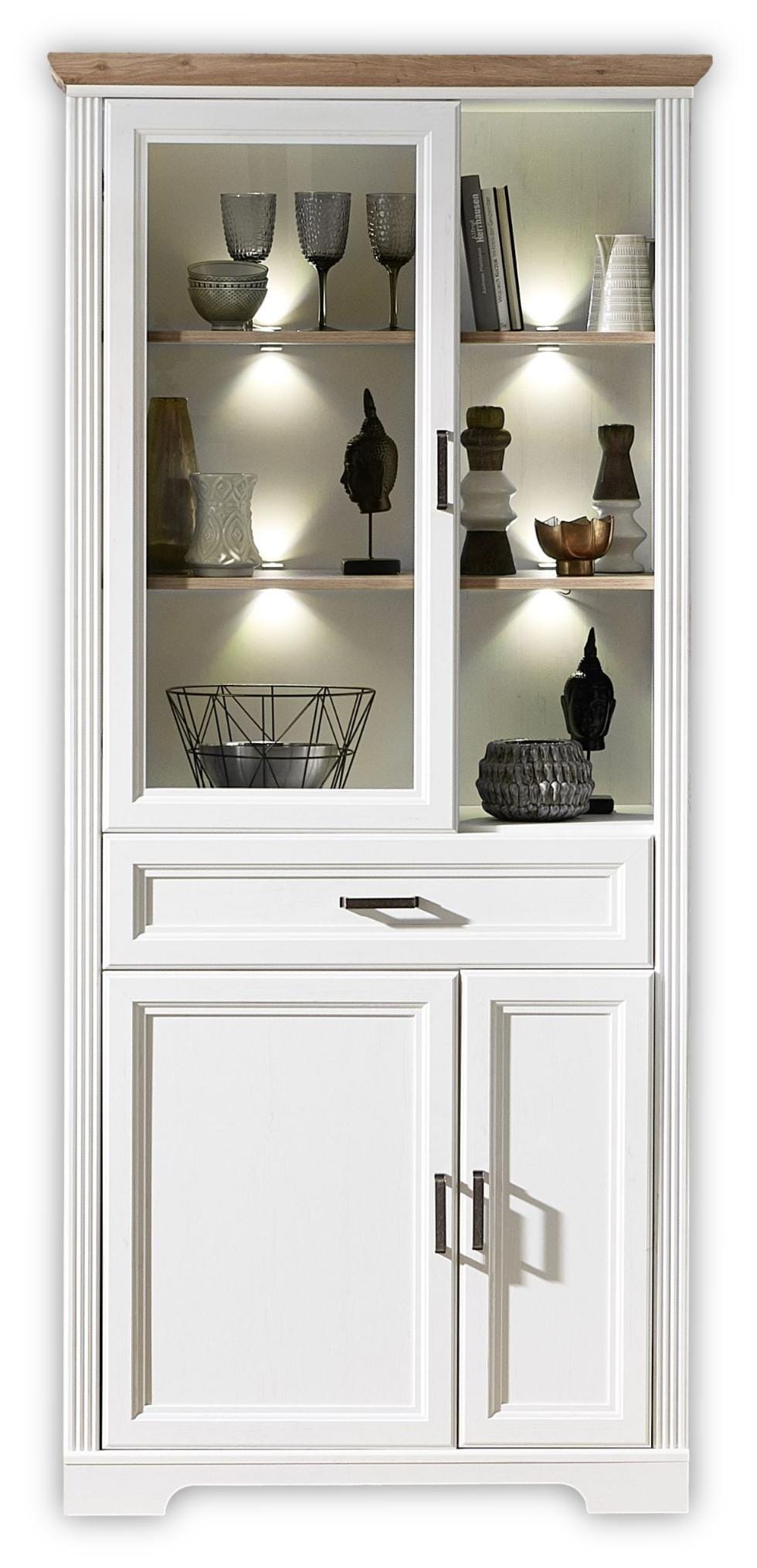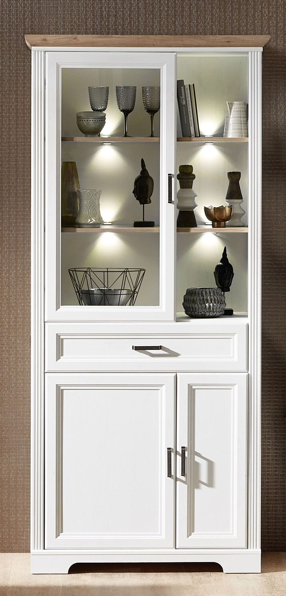 Landhaus Vitrine JASMIN 2-türig - Pinie weiß Nachbildung mit Beleuchtung