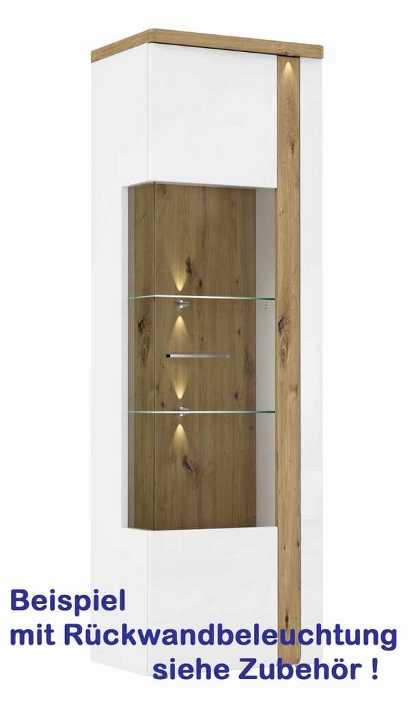 Das schlanke Möbelstück präsentiert sich in einer Kombination aus weißen Hochglanzfronten, warmen Holzeinsätzen aus modern und edel anmutender Artisan Eiche Optik und Glas. Besonders der Glaseinsatz der rechtangeschlagenen Tür verleiht dieser schönen Vitrine Leichtigkeit und Eleganz. Ihre Lieblingsstücke finden in diesem Eyecatcher sicher einen angemessenen Platz.