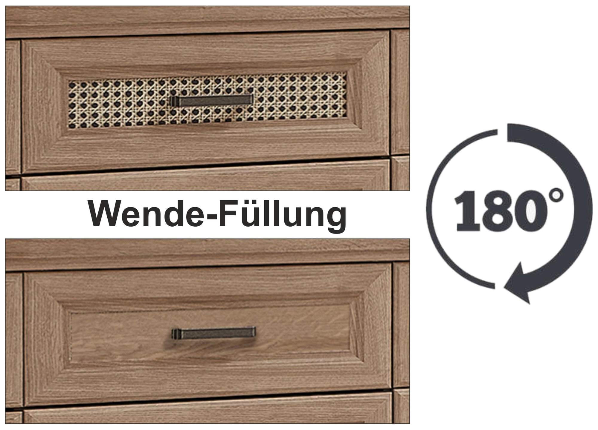 Montieren Sie die Vitrine nach Ihrem persönlichen Geschmack, ob mit trendiger Wiener Geflecht Optik oder etwas schlichter in Eiche - die besonders gelungenen Wende-Füllungen in schönster Kassettentechnik werden Ihnen ganz bestimmt gefallen. Die Türen und Schübe öffnen und schließen dank Soft-Close-Funktion leise und sanft.