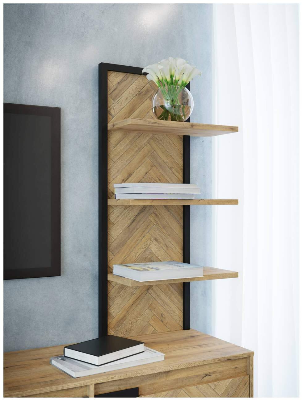 Bei dem Wandboard Solletico sieht man automatisch ein zweites Mal hin. Die ungewöhnliche Optik besticht nicht nur mit der modernen Farbkombination aus heller Spica-Eiche und lässigem Schwarz. Besonders auffällig ist das Fischgrät-Design der Rückseite des Regals. Das Muster kennt man sonst nur von Parkettböden oder schweren Wollstoffen. Hier wurde es zu einem Regal mit Blickfang-Charakter geformt. Um diese tolle Optik noch zu intensivieren, wurde die Maserung der Eiche in das aufwendige Muster integriert.