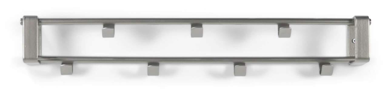 Sie ist aus beschichtetem Metall in Nickeloptik hergestellt und besitzt neun Garderobenhaken. Die Haken sind versetzt auf zwei übereinanderliegenden Stangen angebracht und können alle gleichzeitig benutzt werden. Mit einer Größe von nur 60cm x 10cm x 11,5cm (BHT) lässt sich die stilvolle Garderobe auch in kleine Dielen integrieren. Darüber hinaus macht der Garderobenhaken Rex 1 auch im Schlafzimmer oder im Gästezimmer eine gute Figur.