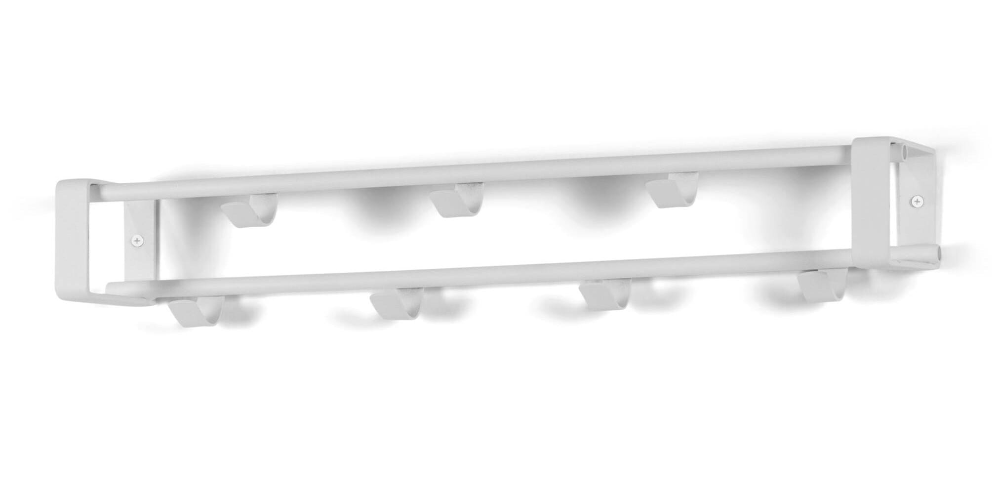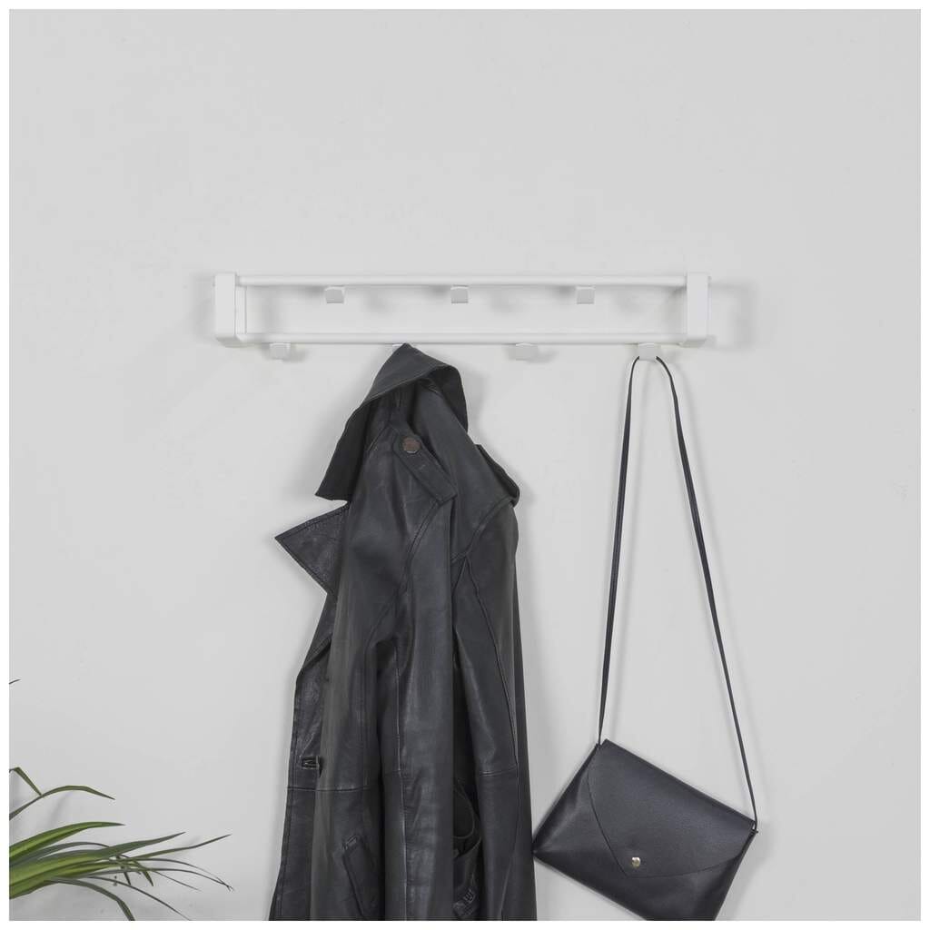Durch ihre glatten Oberflächen in der Farbe weiß passt die Garderobe in geschmackvoll eingerichtete Dielen und Flure. Sie ist vielseitig mit bereits bestehenden Einrichtungen kombinierbar und setzt an die Wand montiert Akzente. Insgesamt sieben Haken, verteilt auf zwei Leisten, bieten viel Platz für Jacken, Taschen, Hüte oder Schals.