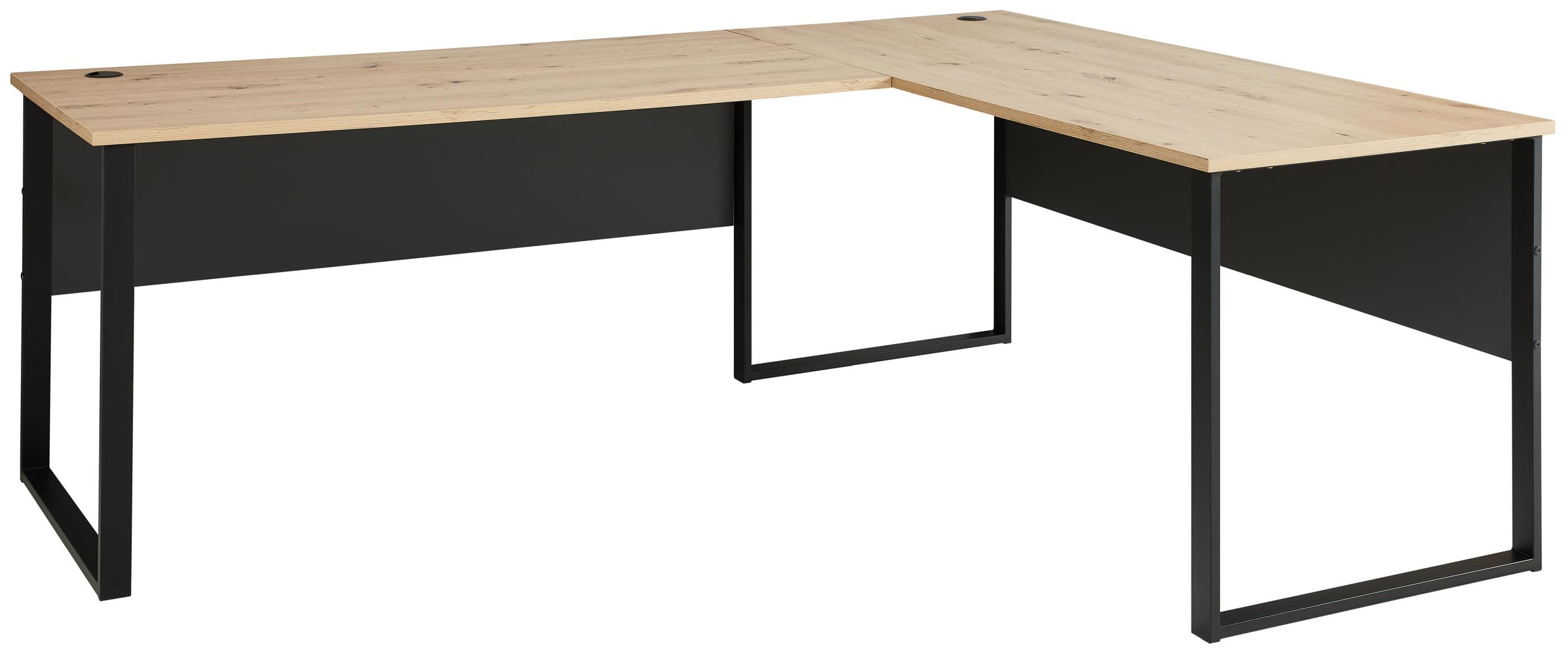 Natürlich hat der Schreibtisch praktische Kabeldurchführungen, die beiden Kabeldurchführungen auf jeder der beiden Tischplatten verhindern nervigen Kabelsalat und sorgen mit dem sauberen Kabelmanagement für einen aufgeräumten Arbeitsplatz.