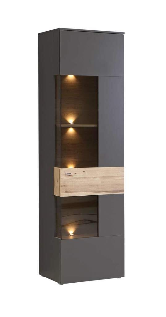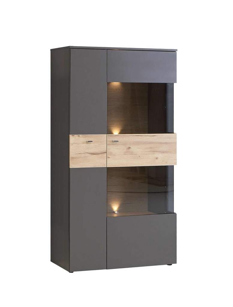 Die Wohnwand COMO punktet mit einer attraktiven Eiche-Nachbildung auf dunkelgrauen Fronten. Zwei Vitrinen bieten auf mehreren Ebenen Platz für zierliche Sammelobjekte, stilvolle Vasen oder ausgefallene Gläser. Zudem können Sie Ihre Lieblingsstücke mit dem passenden Licht wunderbar in Szene setzen. Außerdem steht beim Lowboard der Stauraum hinter zwei Türen und einer Schublade zu Ihrer Verfügung; das offene Fach kann beleuchtet werden. Auf dem Wandboard lassen sich unter anderem Bücher, Bilderrahmen und DVDs platzieren.