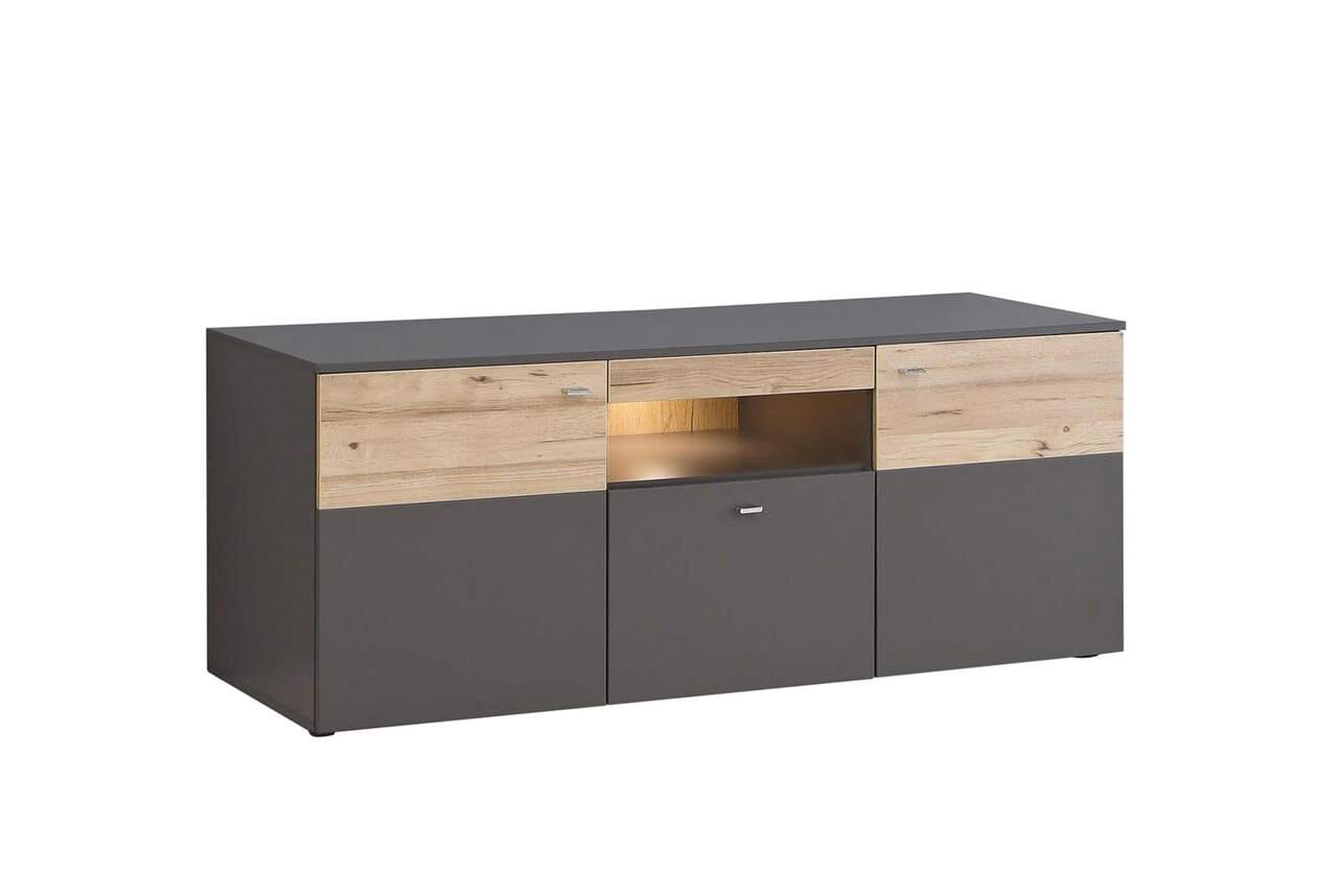 Die schicke Wohnwand COMO sorgt für einen charmanten Aspekt in Ihrem Wohnzimmer. Immer wieder wird der Blick von der hellen Eiche auf dem ansonsten dunkelgrauen Korpus angezogen. Dazu passt besonders gut eine dunkelgraue oder holzfarbene Couch. Falls Sie jedoch Kontraste lieben, ist auch eine farbige Sitzgelegenheit willkommen.
