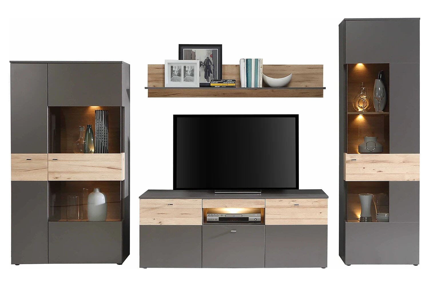 4-tlg. Wohnwand COMO, in elegantem Grau und Absetzungen in Balkeneiche Optik.