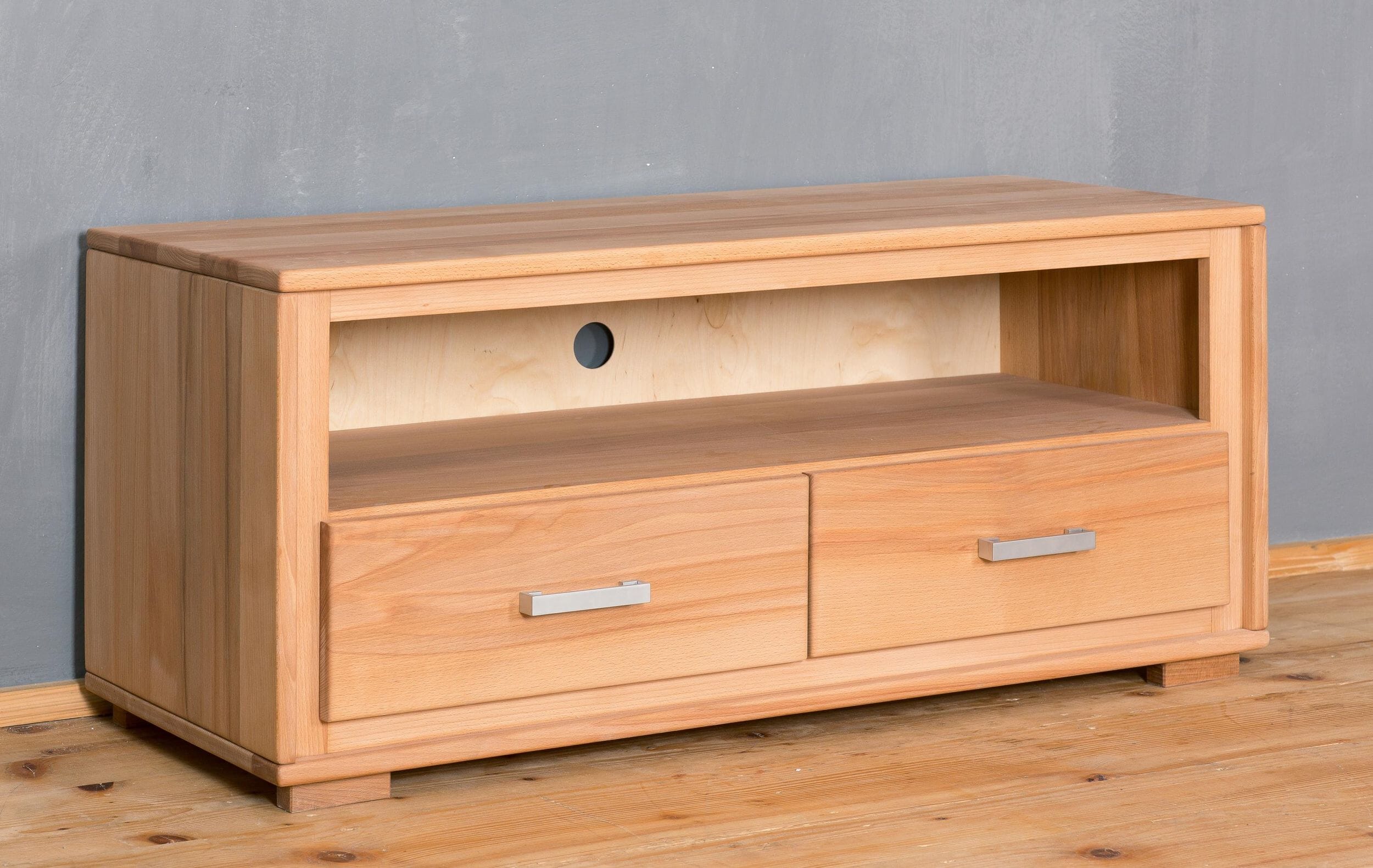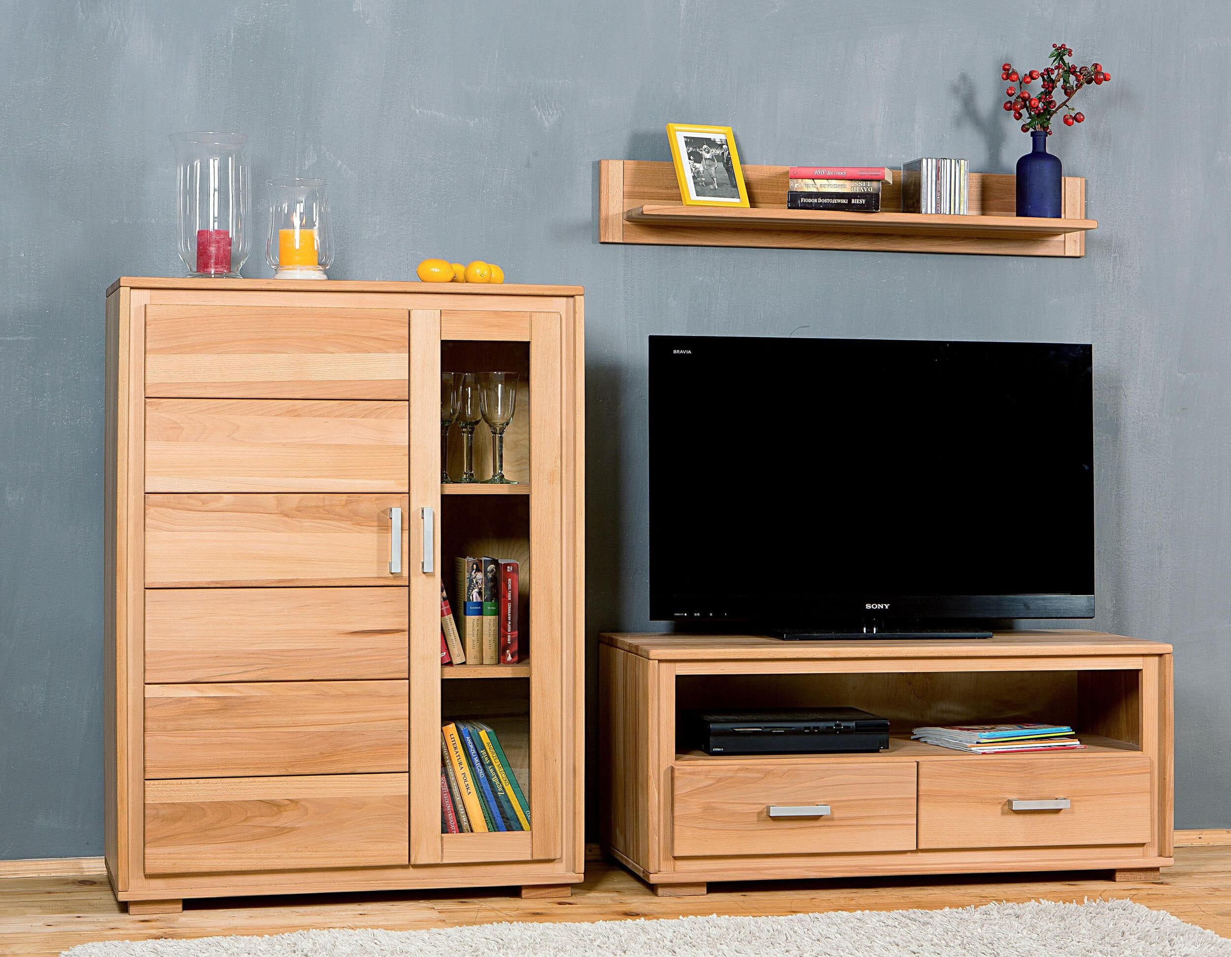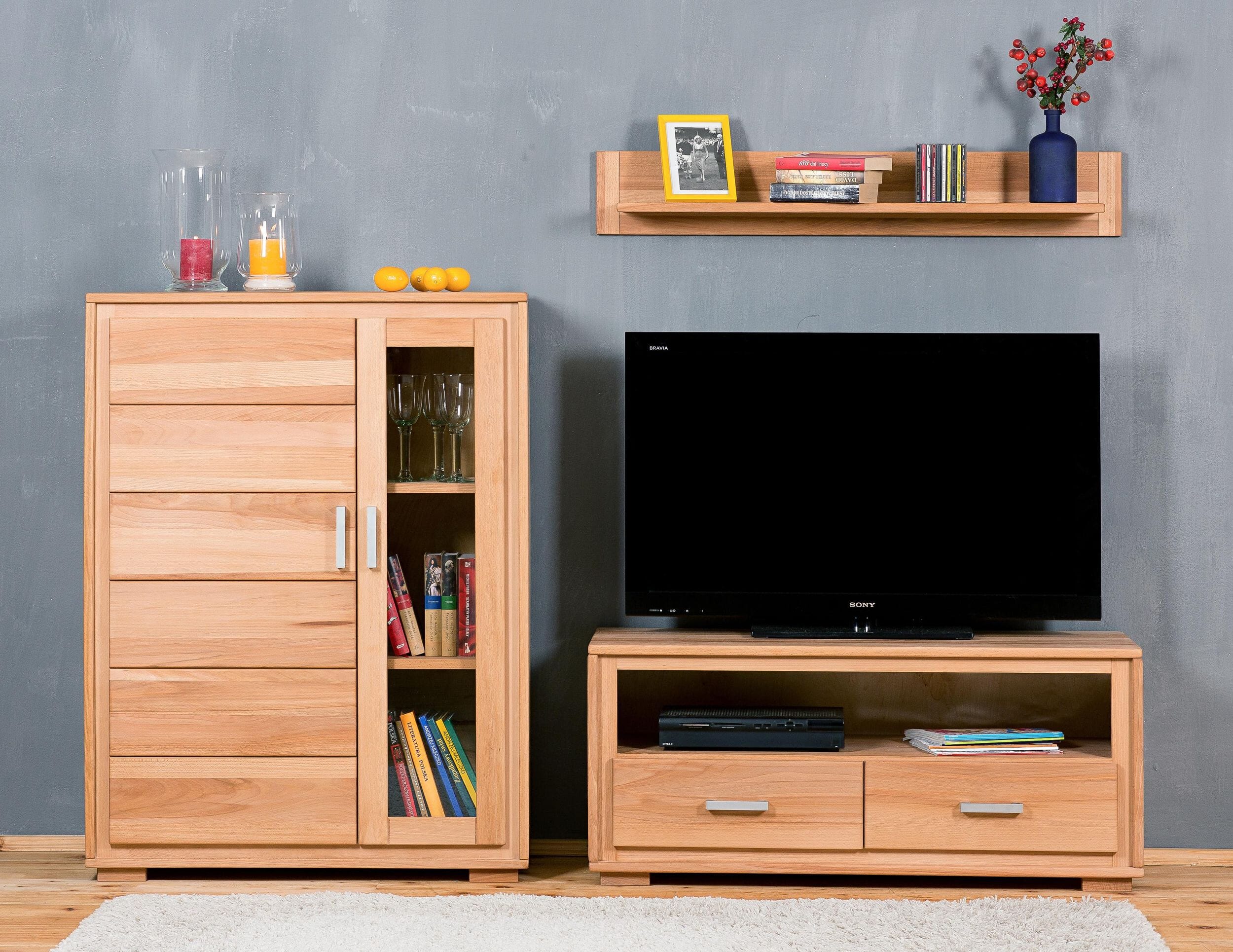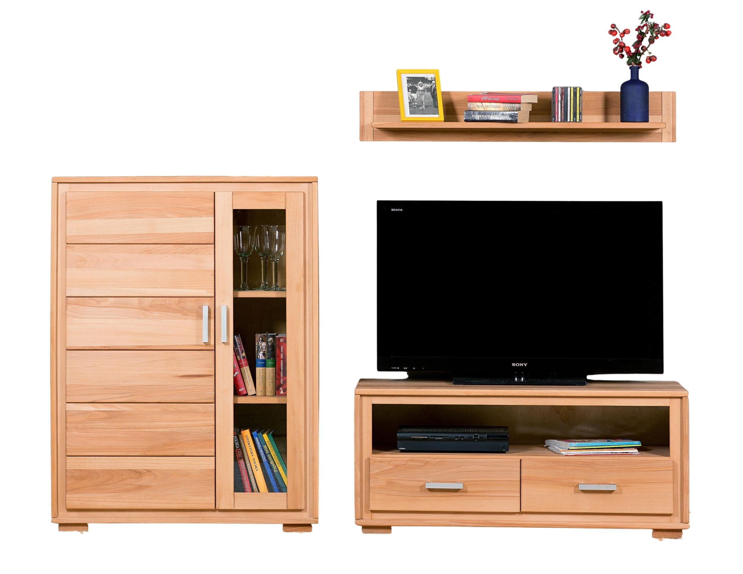 Die 3-teilige Wohnwand Genf Set II aus massiver Kernbuche ist besonders für kleinere Zimmer oder ein Gästezimmer bestens geeignet.