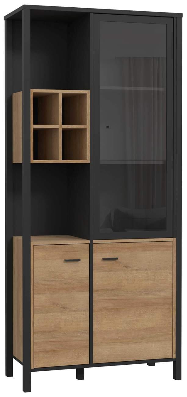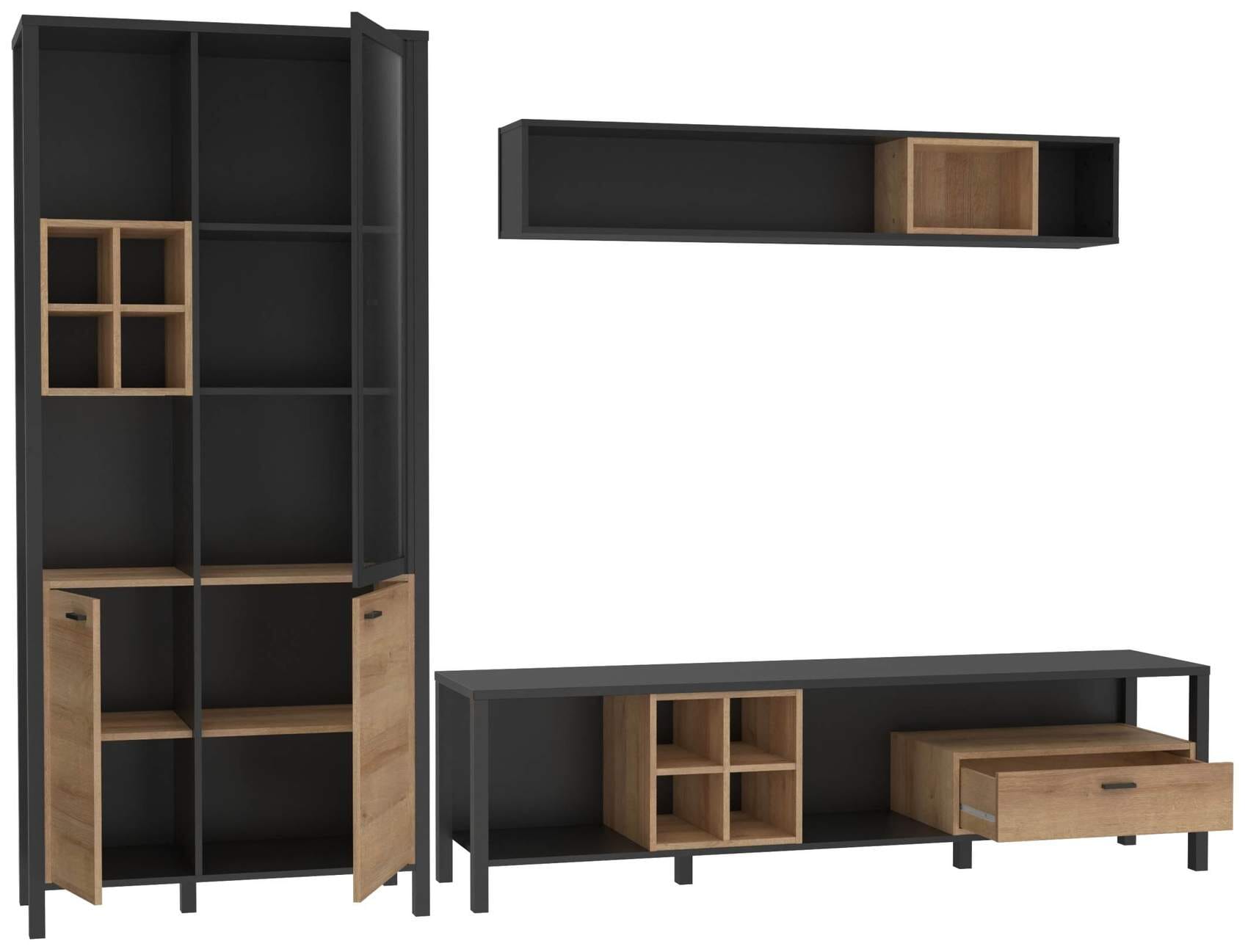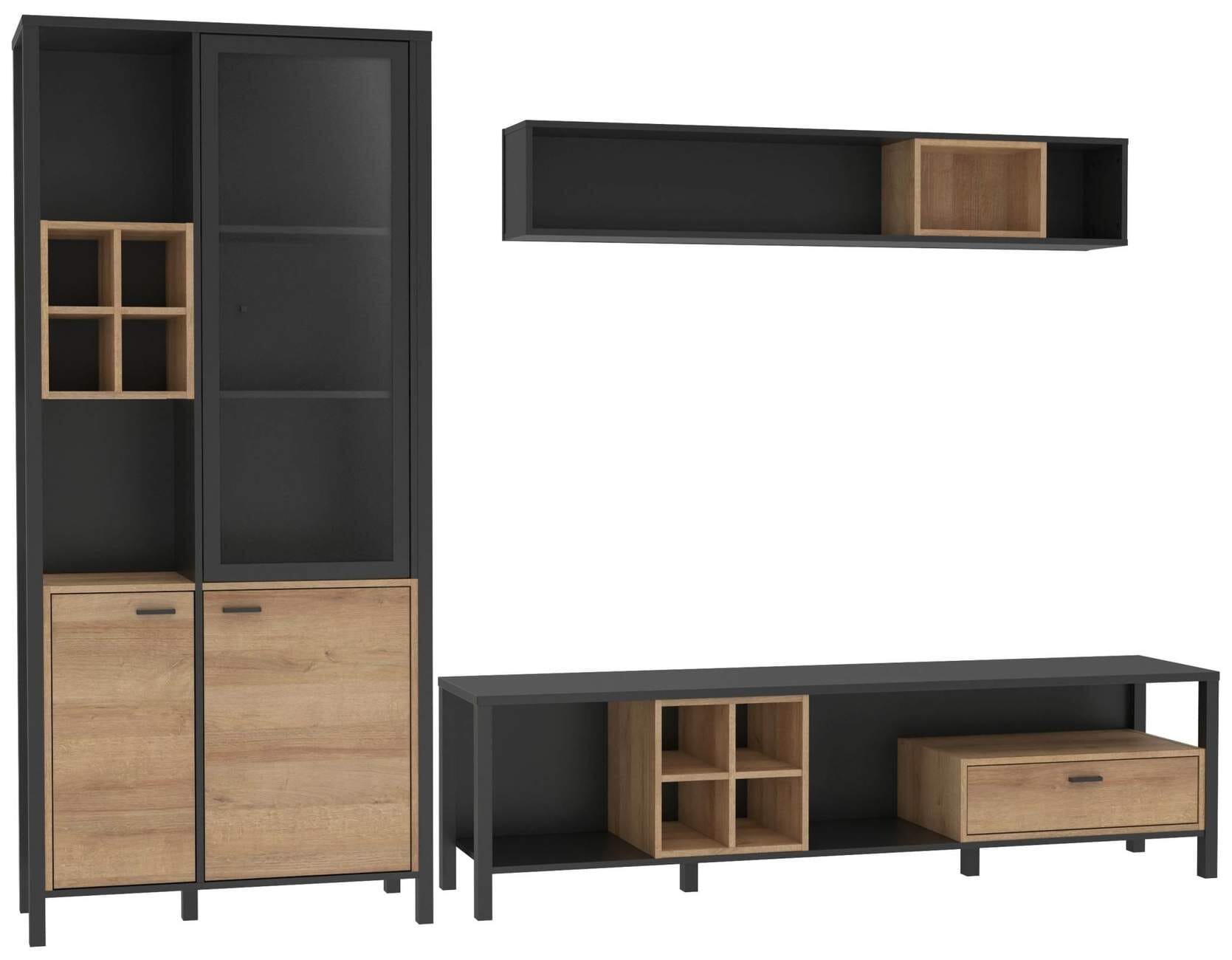 Die Vitrine hat offene Regalelemente mit verstellbaren Einlegeböden, teils hinter Glas, und einen Schrank mit Türen in Holzoptik. Das Lowboard mit offenen Fächern und einer Schublade bietet Ihnen Platz für den Fernseher und weitere Mediengeräte. Abgerundet wird das Set durch ein Wandboard, das ebenfalls ein interessantes Design hat. Wie Sie die Teile der Wohnwand HIGH ROCK kombinieren, bleibt Ihnen überlassen. Mit den stylishen Möbeln ist Ihr Wohnzimmer perfekt eingerichtet.