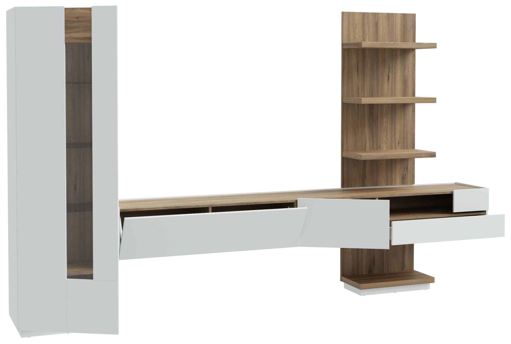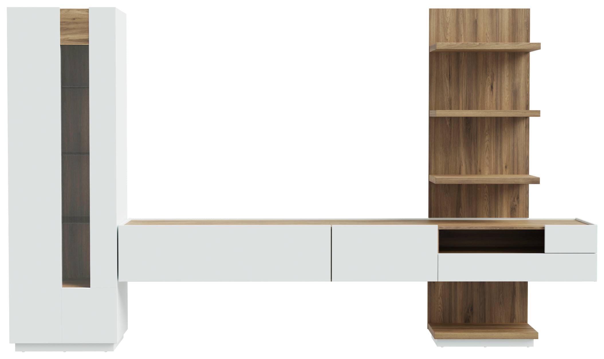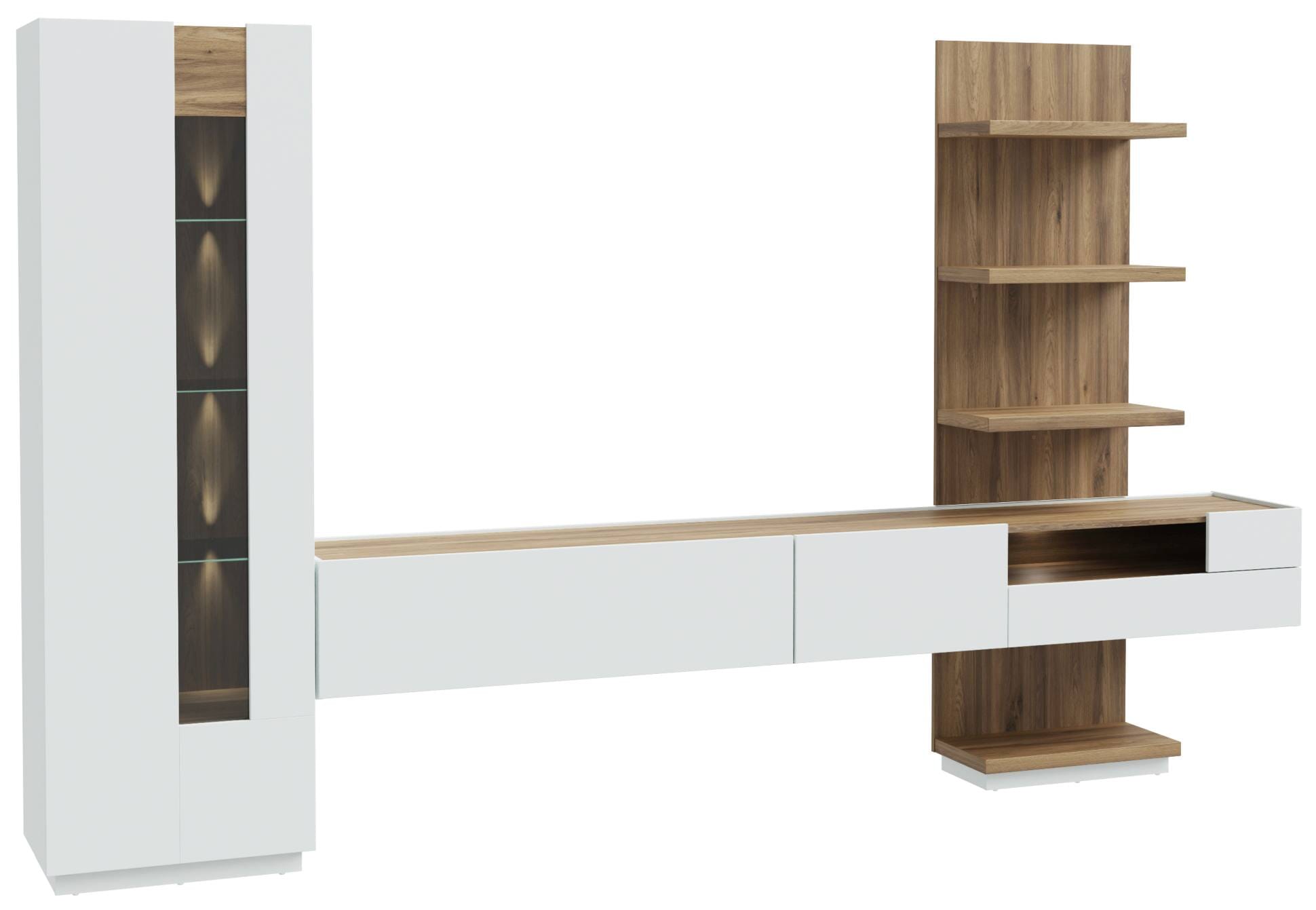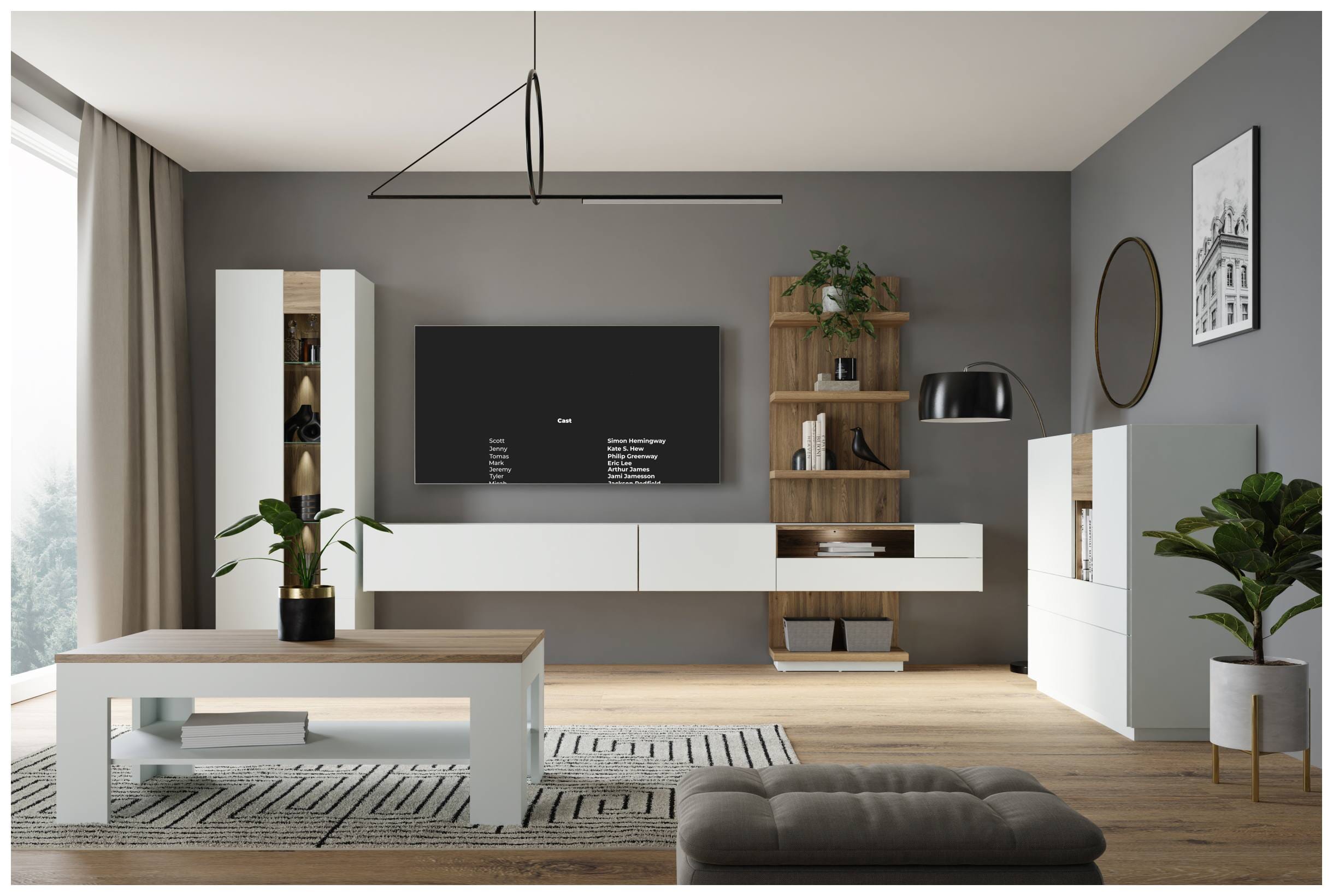 Wow, das ist mal ein Set: Die Wohnkombination Wohnwand LEWISVILLE 02 bringt frischen Wind in ein modernes Ambiente und bietet Ihnen auch noch sehr viel Platz und diverse schöne Extras. Die vier Elemente ergänzen sich perfekt, gerade, weil sie sehr unterschiedlich sind. Ein harmonisches Ganzes entsteht hier aus einer Vitrine, die keine Wünsche in punkto Platz und Optik unerfüllt lasst, einem Wandregal, das zeigt, dass minimalistisch immer auch attraktiv ist und einem breitem TV Lowboard das an Ihrer Wand schwebt. Darunter gibt es noch ein kleines Regalelement als optische Erweiterung des Wandboards.