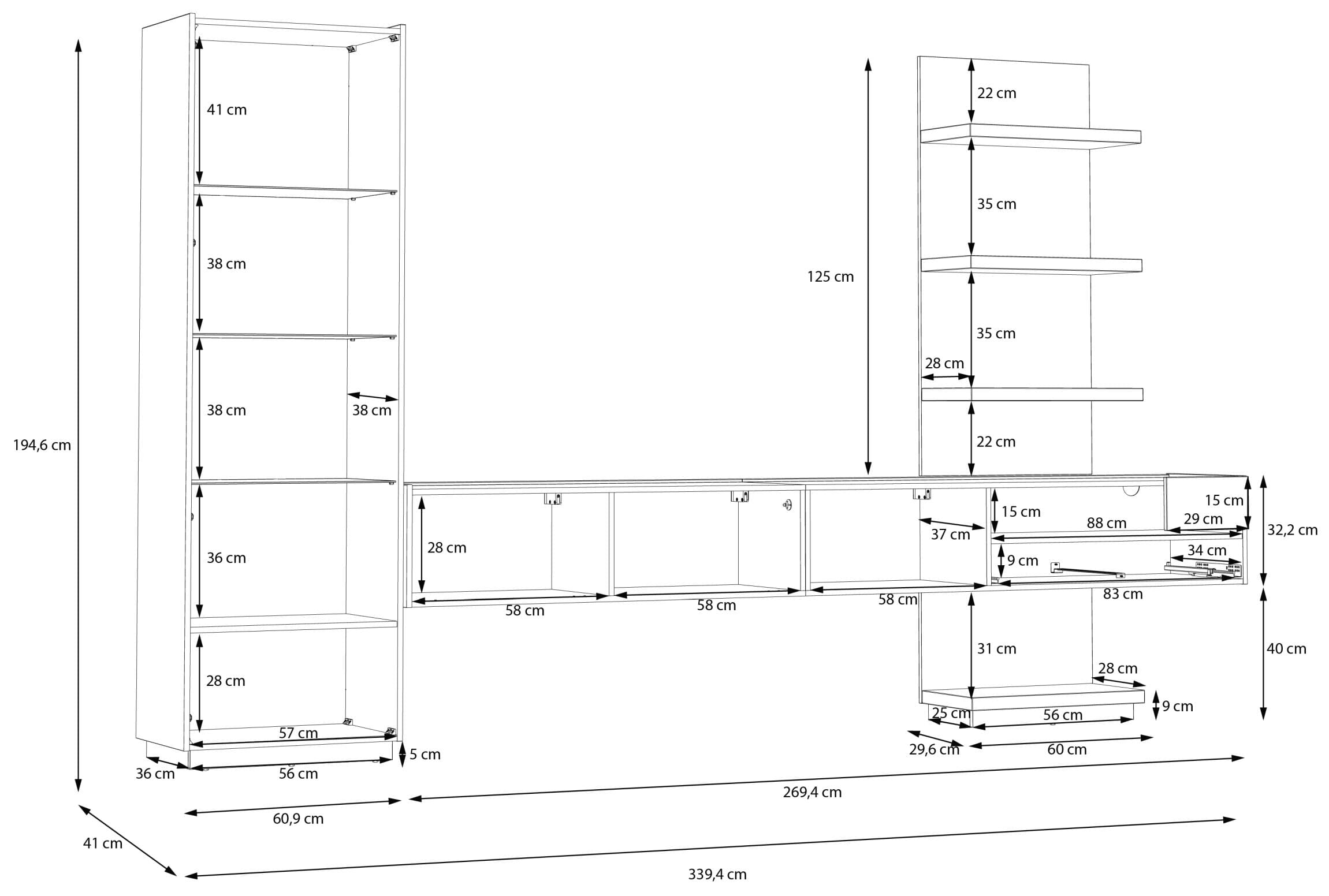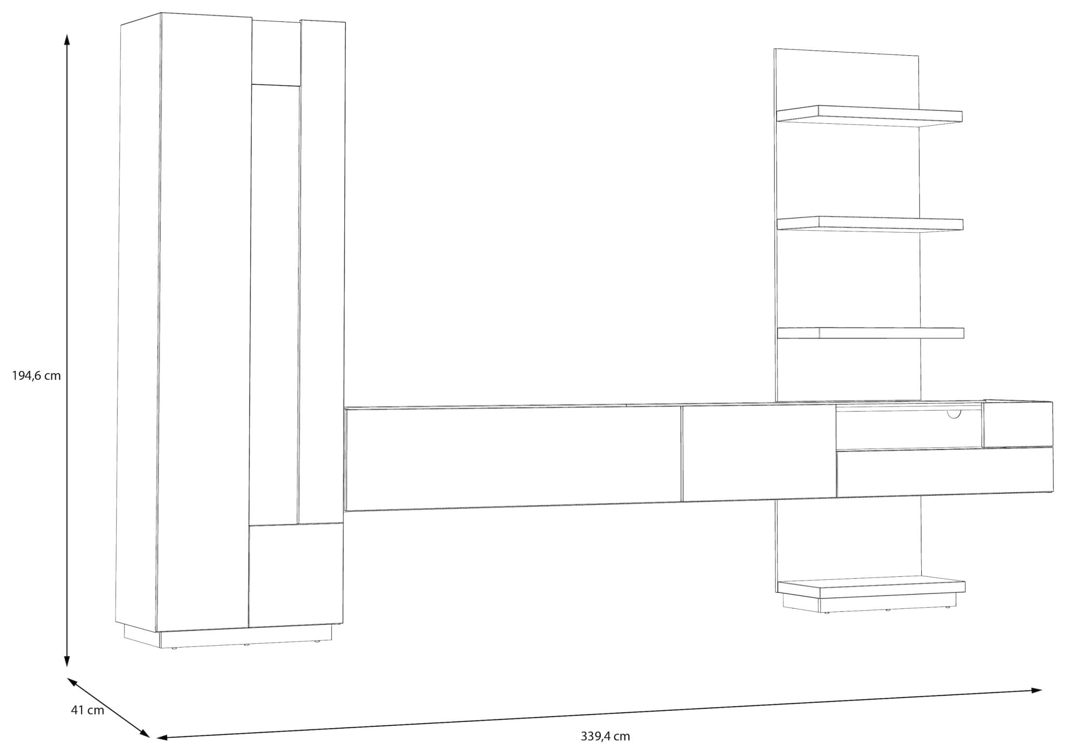 Stellmaß Wohnwand wie abgebildet: B/H/T 339,4 x 194,6 x 41 cm