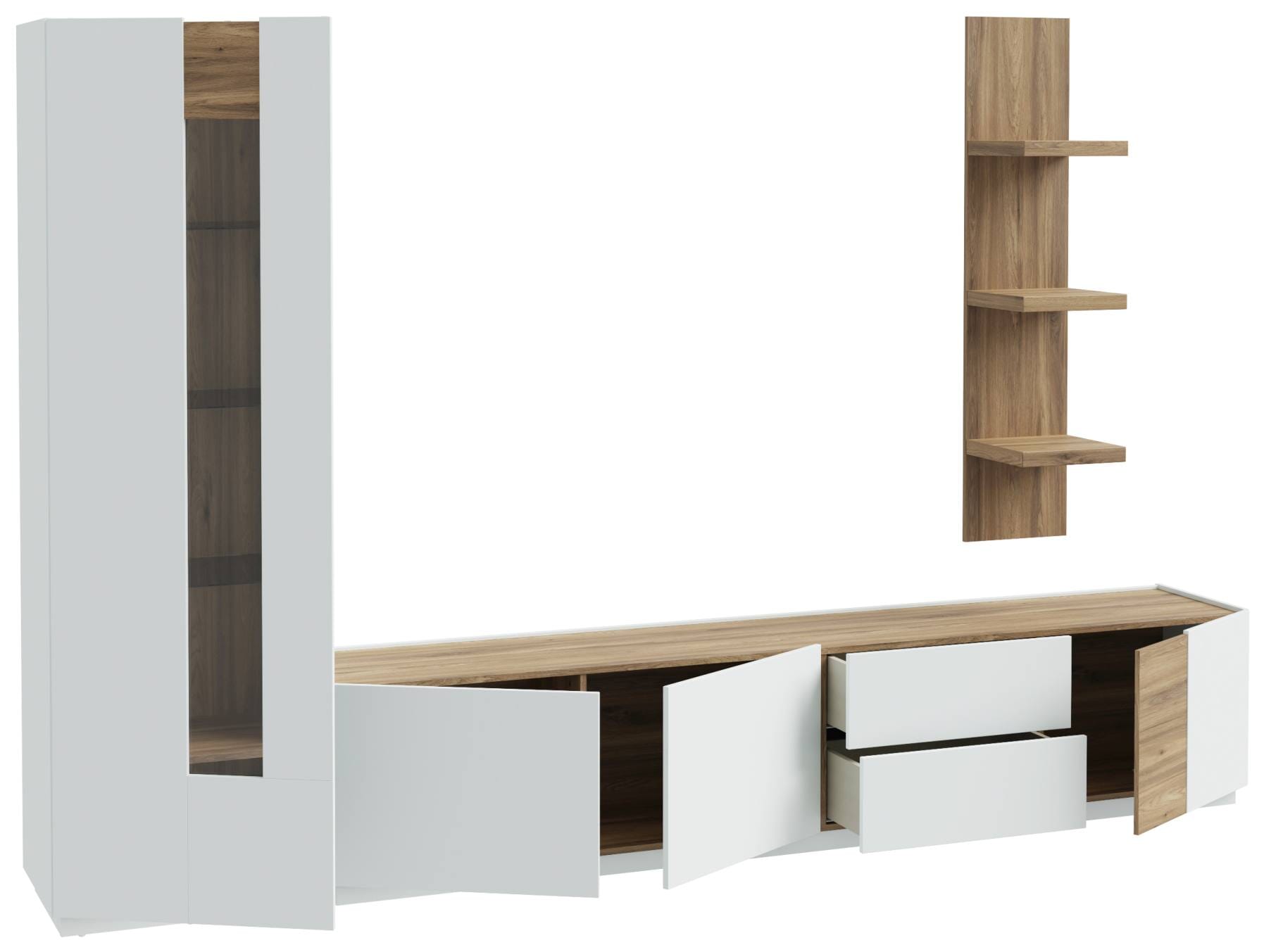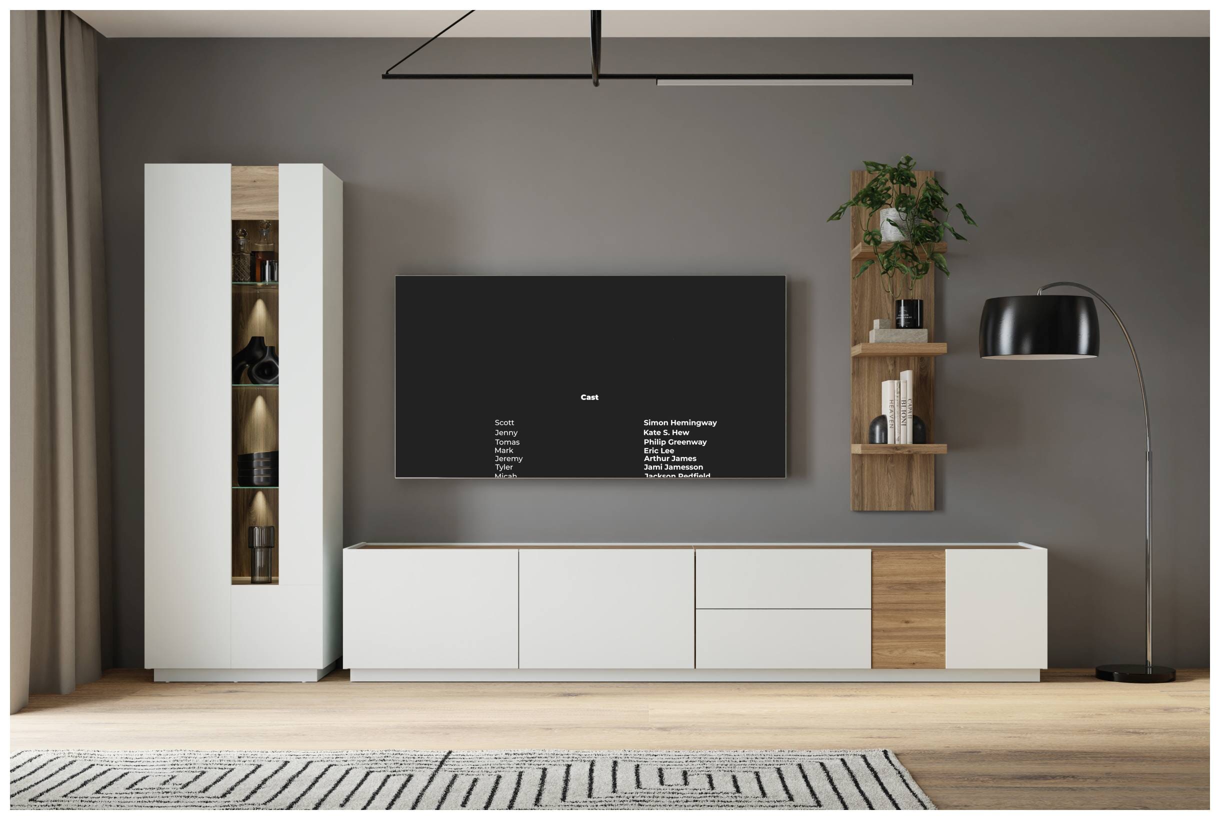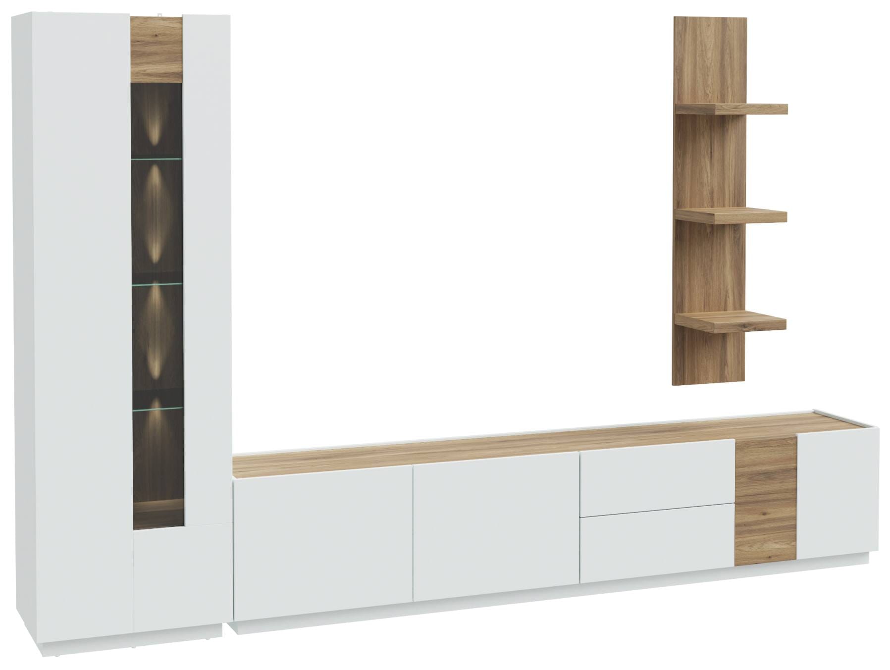 Sehr cool, elegant und überaus praktisch: Die Wohnkombination Wohnwand LEWISVILLE bringt frischen Wind in ein modernes Ambiente und bietet Ihnen auch noch sehr viel Platz und diverse schöne Extras. Die drei Elemente ergänzen sich perfekt, gerade, weil sie sehr unterschiedlich sind. Ein harmonisches Ganzes entsteht hier aus einer Vitrine, die keine Wünsche in punkto Platz und Optik unerfüllt lasst, einem breitem TV Lowboard und einem schmalen Wandregal, das zeigt, dass minimalistisch immer auch attraktiv ist.