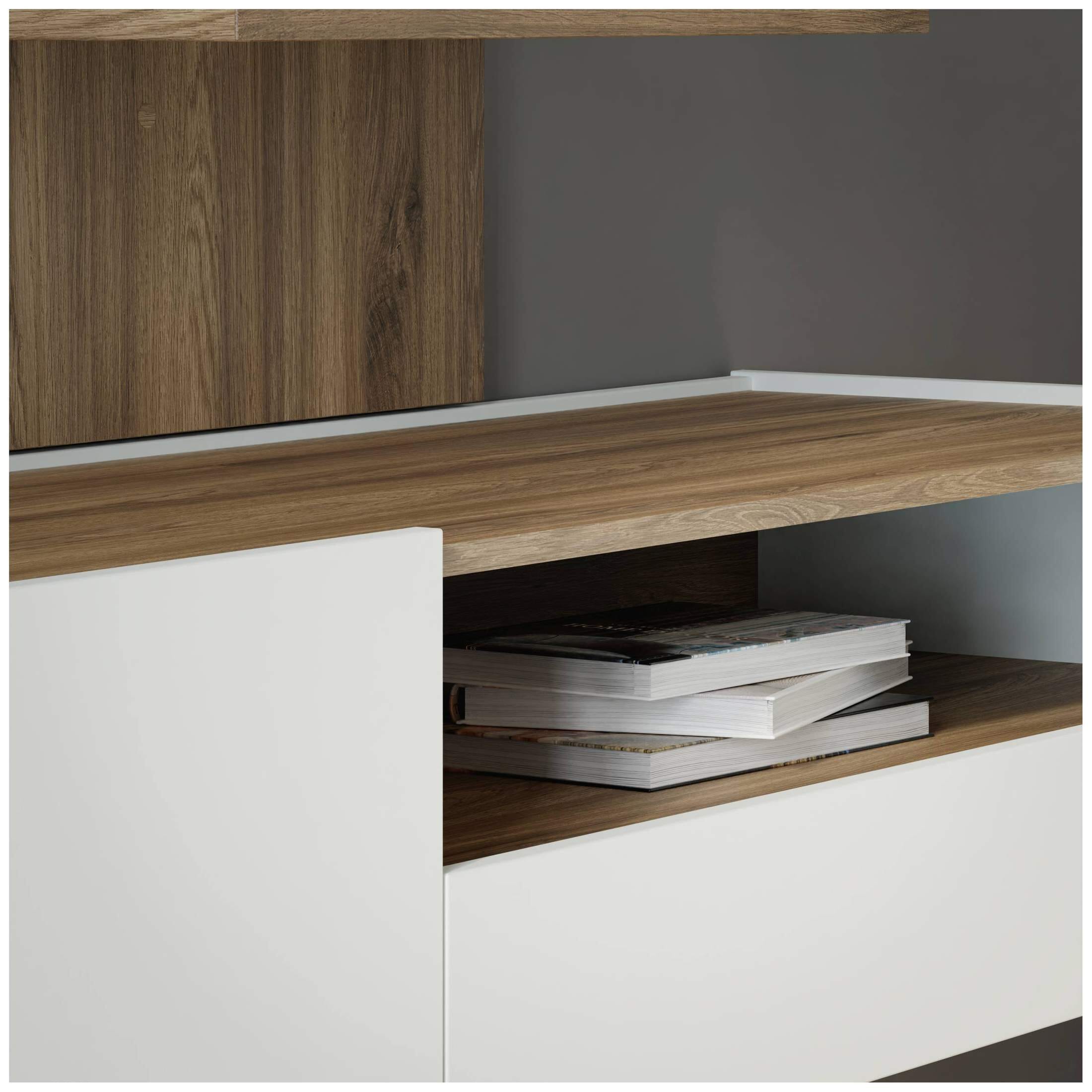 Das Material ist robust und langlebig: Beschichtete Spanplatte, im Farbton Secret Grey mit Absetzungen in Valencia Eiche. Dieses Dekor ist echt angesagt. Soft-Close-Funktion bei den Türscharnieren und Push-To-Open-Technik an den Schubladen des Lowboards sind Garanten für ein bequemes Handling. Zum Öffnen der Türen nutzen Sie einfach den kleinen Überstand an der Oberseite.