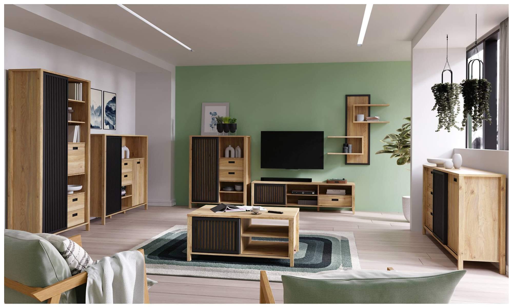 Im Zentrum steht die Wohnwand für Ihr Fernsehgerät sowie weitere elektronische Geräte. In dem hohen Schrank mit toller Regaleinteilung oder auch im breiteren Highboard gibts offene Stellflächen sowie Schubladen und Türen für all das, was von einem gemütlichen Abend ablenkt. Sollte der Stauraum dennoch nicht genügen, bietet das Sideboard zusätzliche Volumen an.