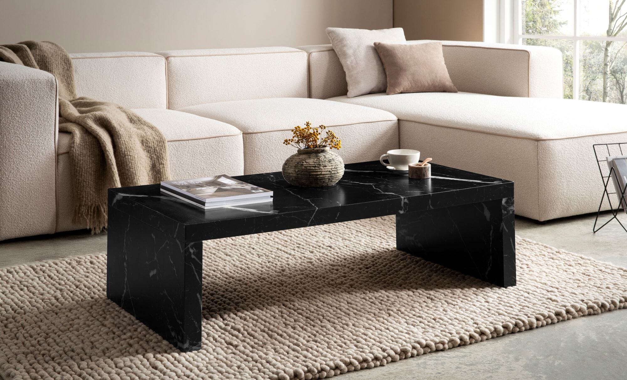 Entdecken Sie den perfekten Couchtisch, der Eleganz und Funktionalität in Ihr Wohnzimmer bringt. Mit seiner schlichten U-Form und der großen Tischplatte in matter Marmoroptik ist dieser Tisch ein echter Hingucker.