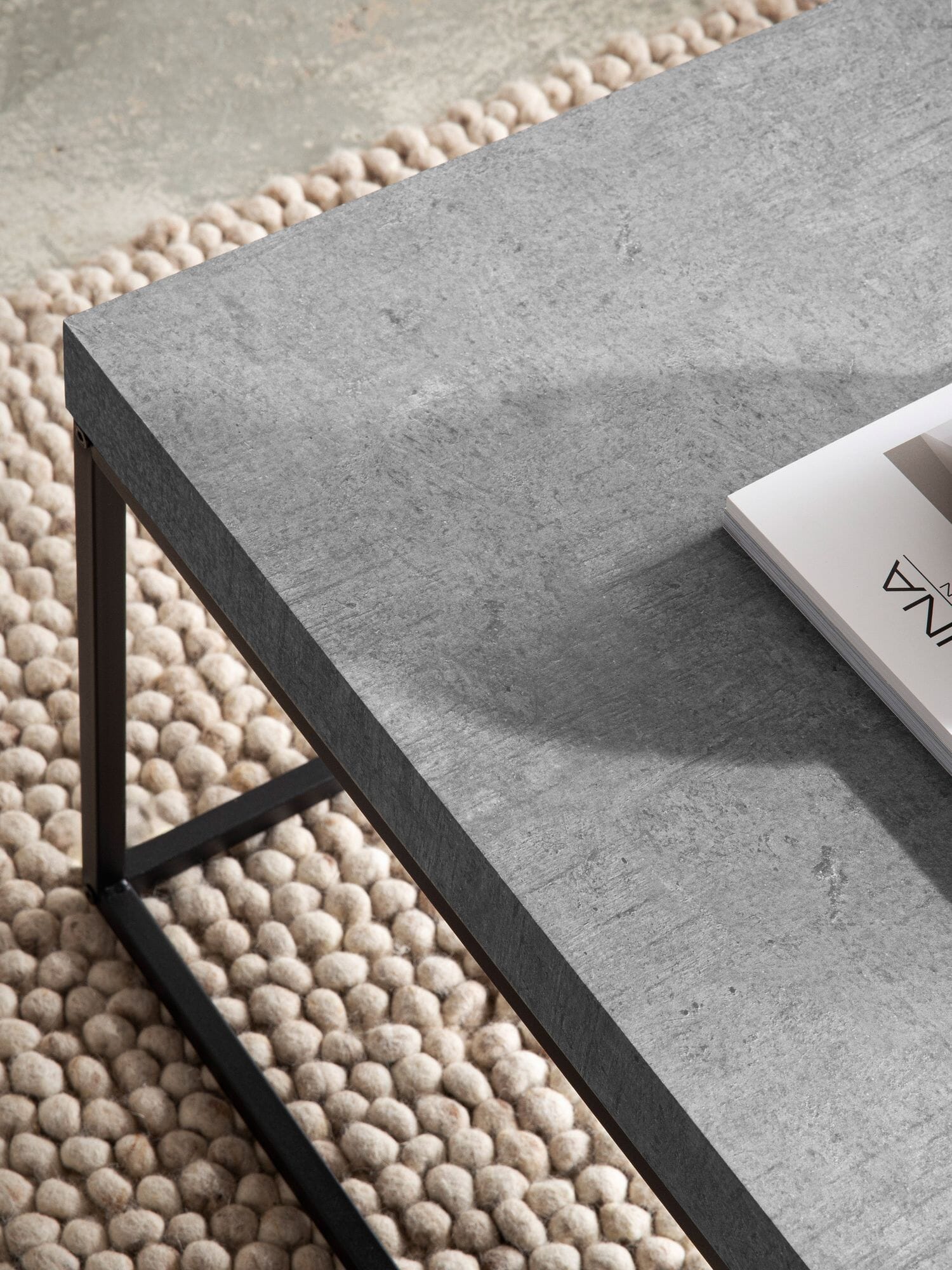 Entdecken Sie den schlichten Couchtisch, der modernes Design mit Funktionalität vereint. Die große Tischplatte in matter Betonoptik bietet ausreichend Platz für all Ihre Utensilien, während das robuste Metallgestell für Stabilität sorgt.