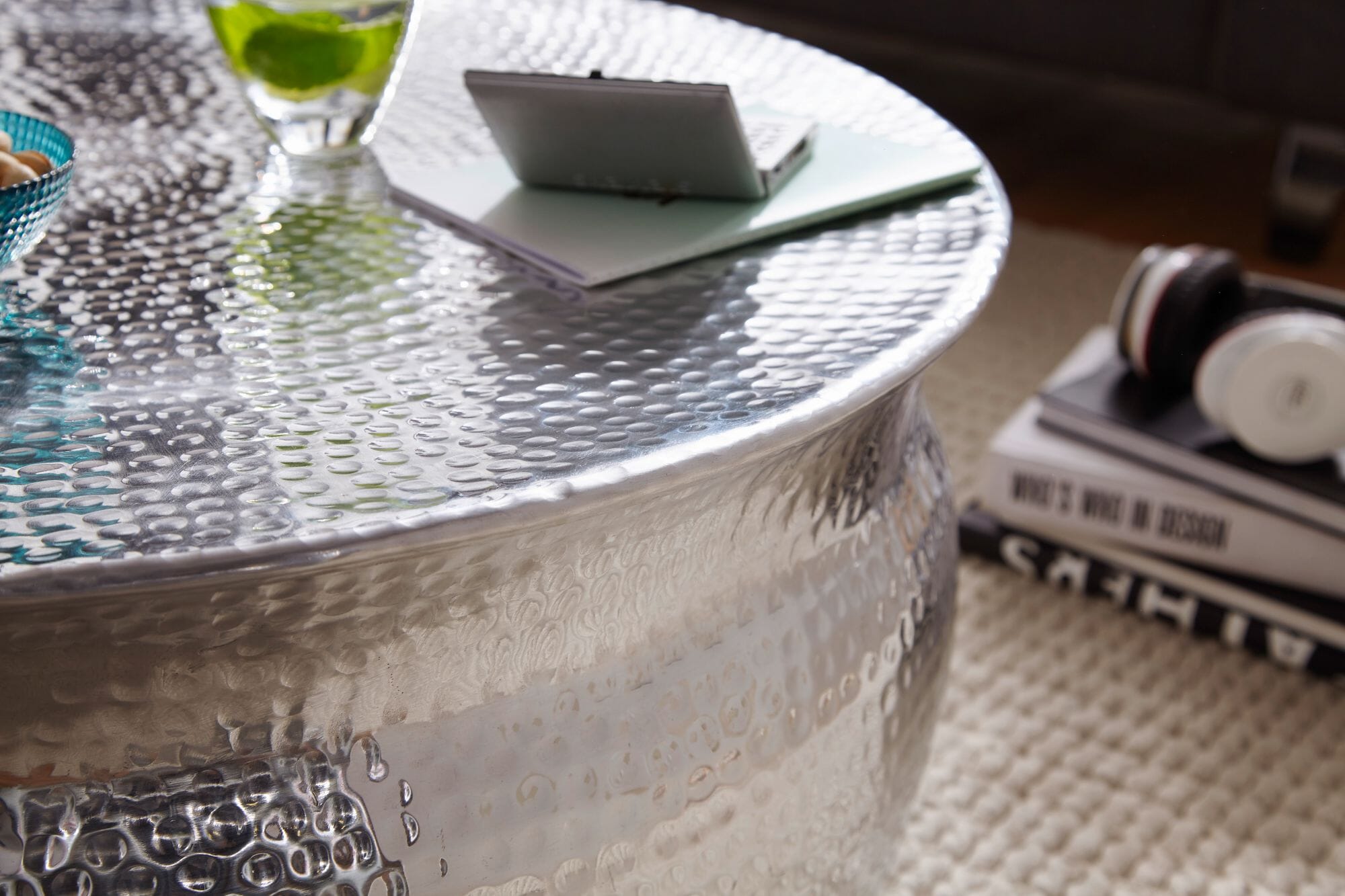 Der Couchtisch bietet eine großzügige Ablagefläche für Ihre Fernbedienung, Zeitschriften und mehr. Die wunderschöne Hammerschlag-Struktur macht ihn zu einem absoluten Blickfang. Dank der runden Form und der hochwertigen Verarbeitung ist er besonders stabil.