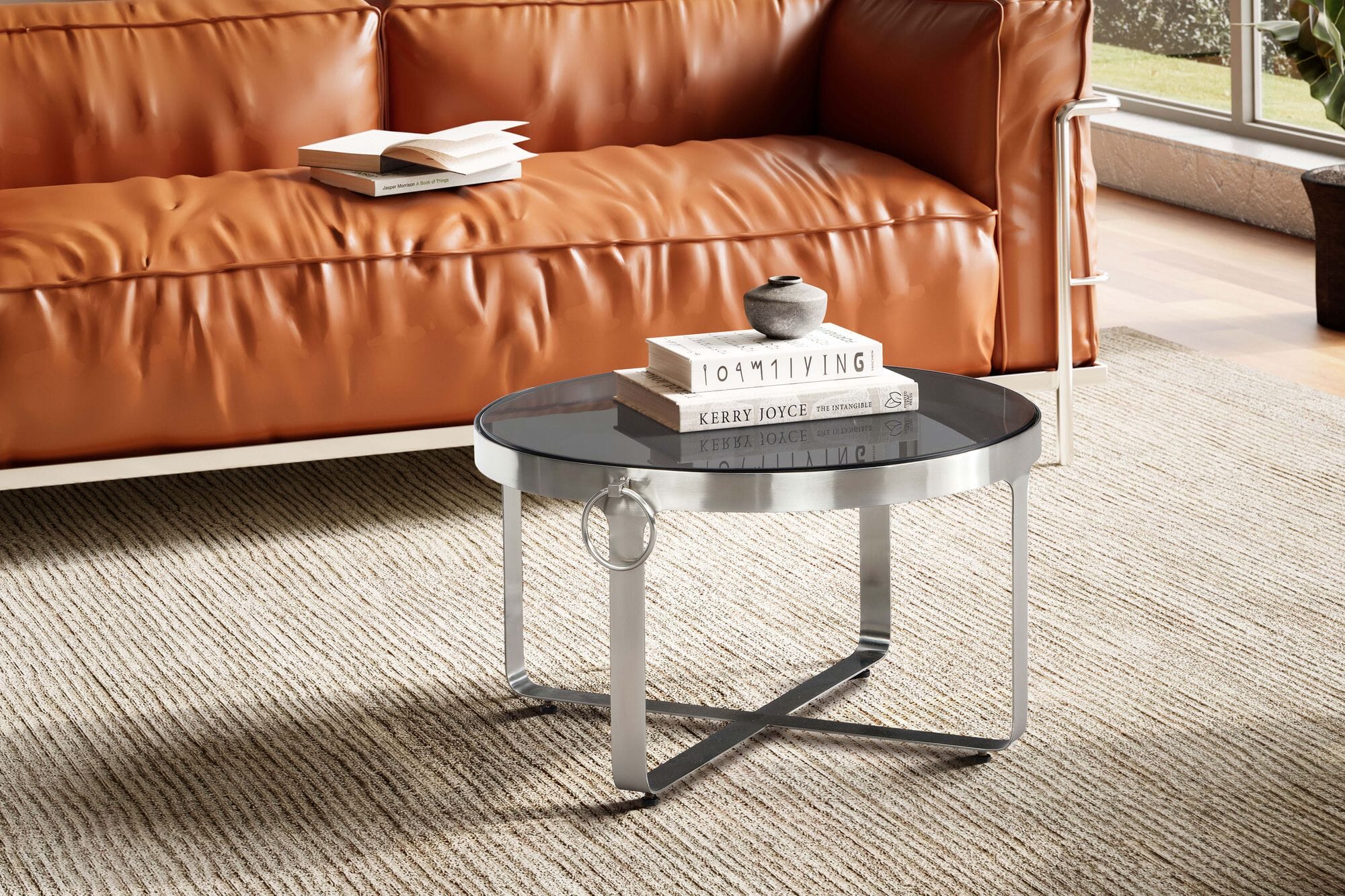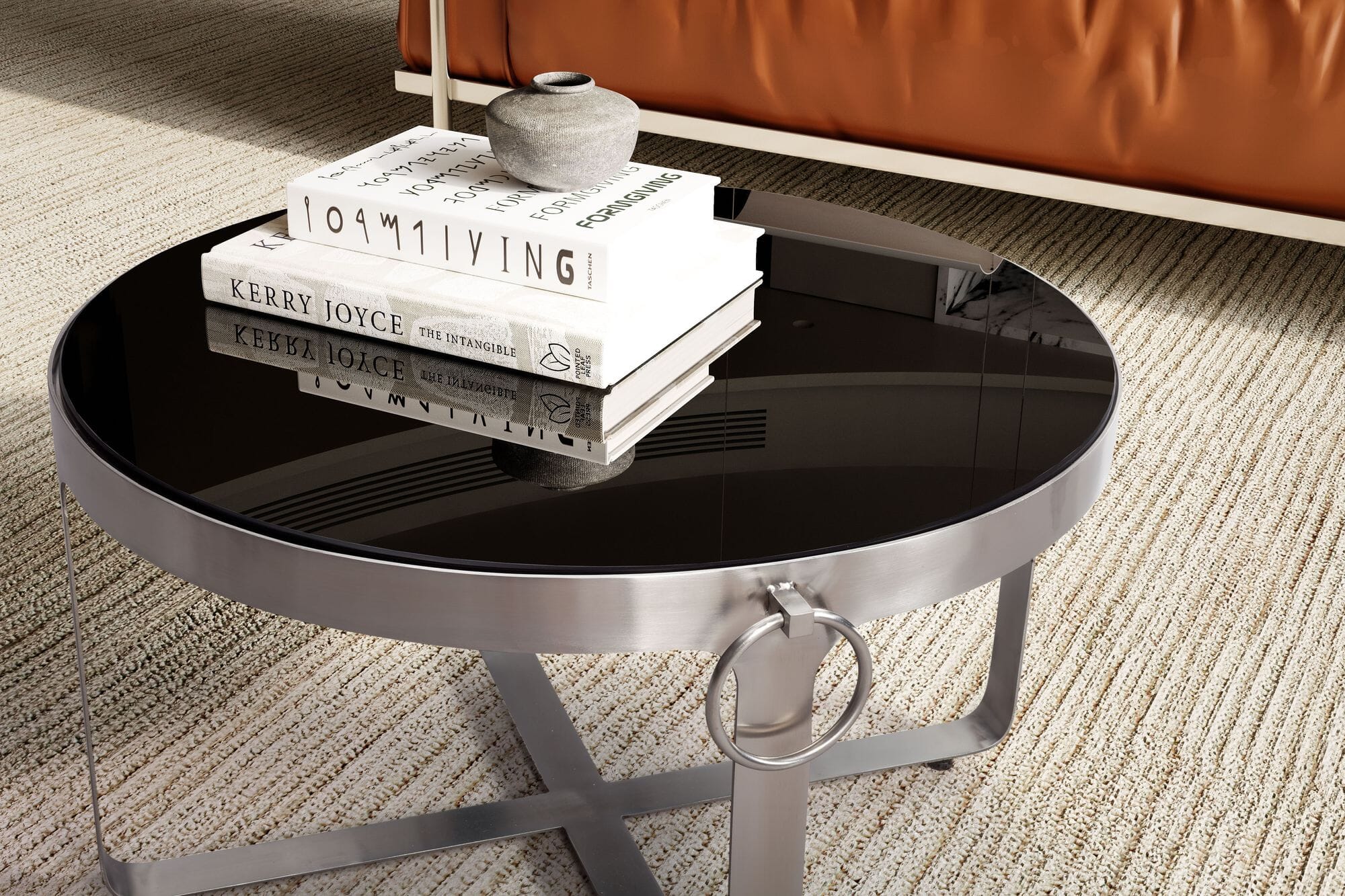 Runder Couchtisch aus Sicherheitsglas und poliertem Stahl im modernen Design