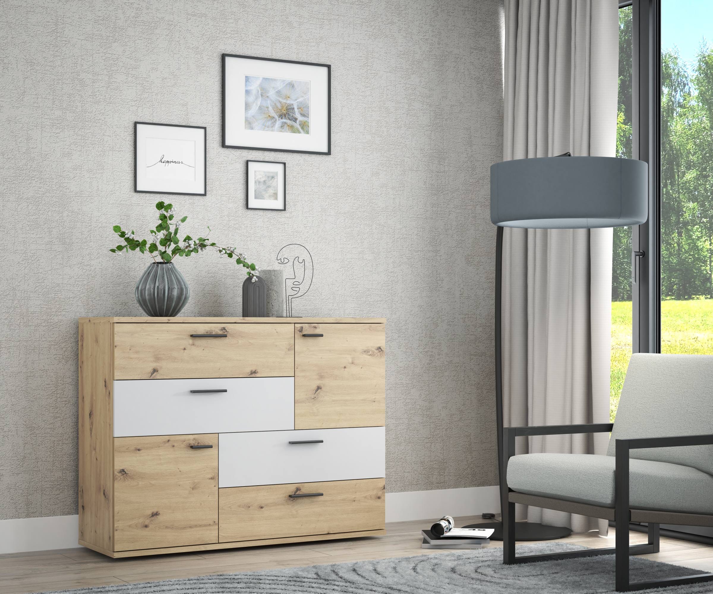 Hell und freundlich in den Farben Artisan Eiche und Secret Grey gehalten sorgt die Kommode SKIVE in Wohn- oder Arbeitsbereichen für ein ansprechendes und gleichzeitig aufgeräumtes Lebensgefühl. Schön kompakt und dennoch ein Hingucker - die Kommode behauptet ihren Platz ganz famos, egal, wo Sie das gute Stück aufstellen. Die Optik kann man als schlicht und modern bezeichnen.