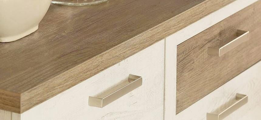 Drei Türen und drei Schubladen bieten richtig viele Möglichkeiten dazu, dem Zwang, Etwas Aufräumen zu müssen, nachgeben zu können. Und die Optik passt auch. Das liegt vor allen Dingen an der raffinierten Kombination aus den naturnahen Dekoren Pinie Weiß und Eiche antik. Weiß ist hier die Grundfarbe, die durch das Eichedekor, das die Schubladen ziert, wunderbar ergänzt wird.