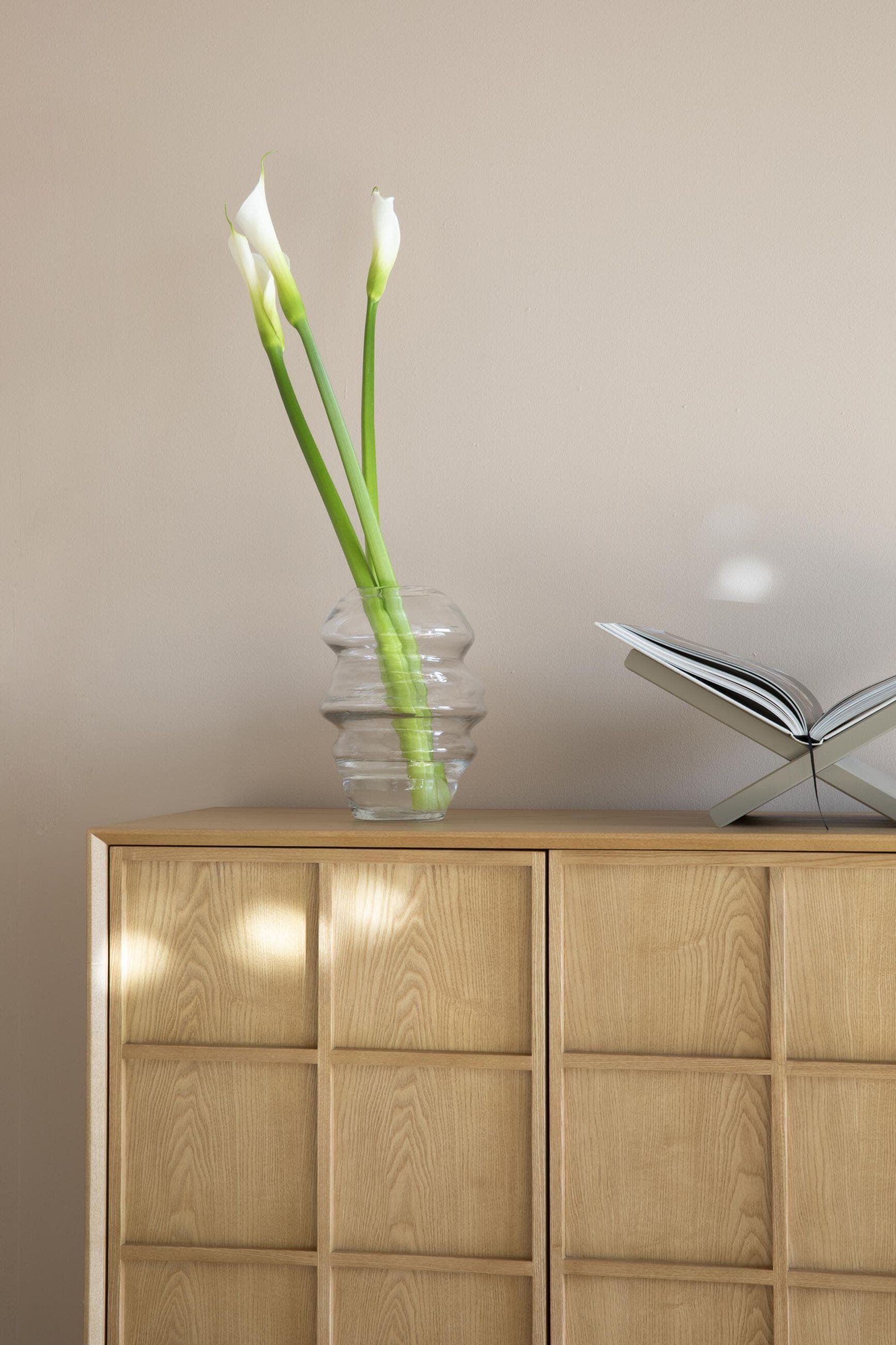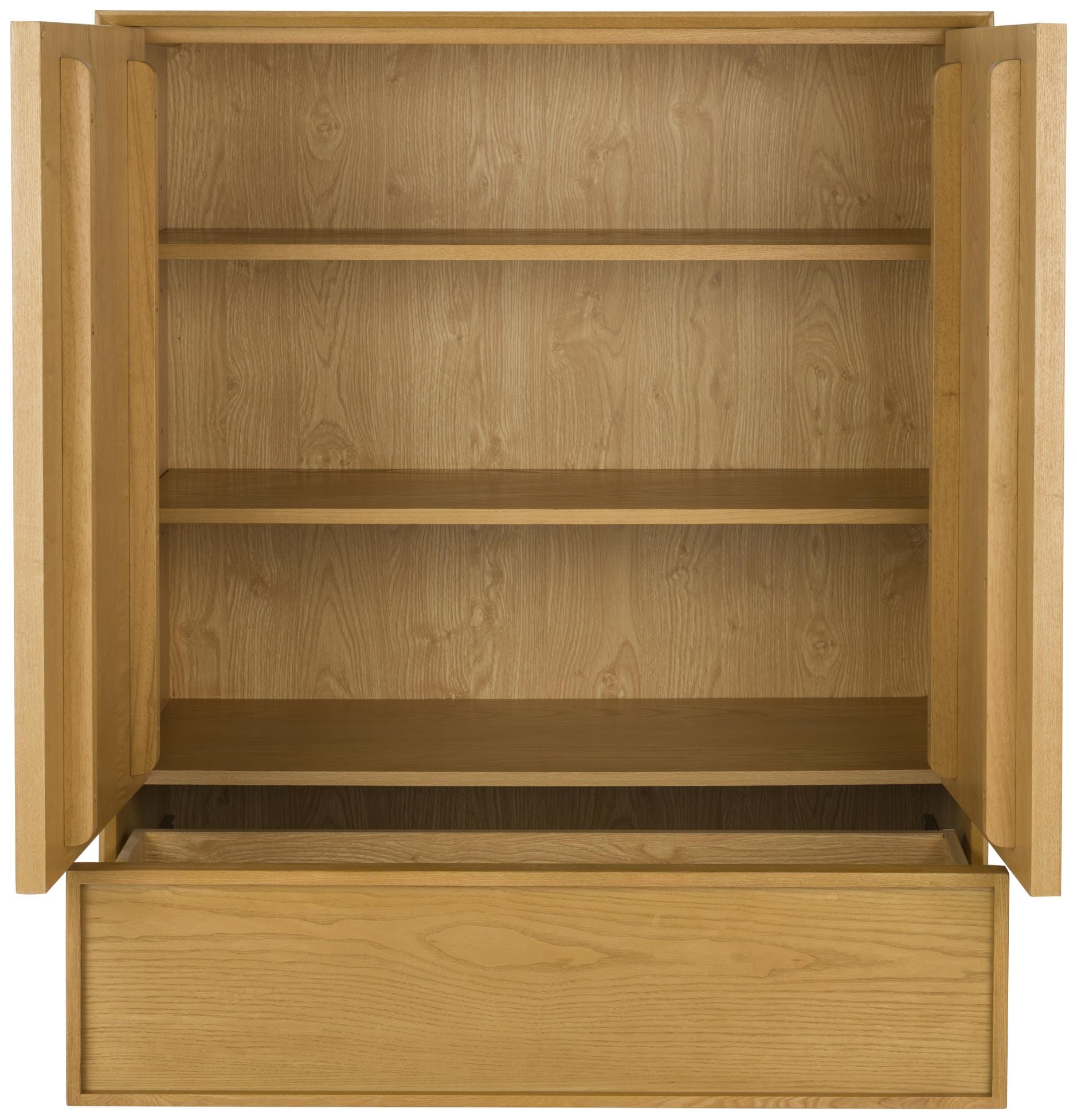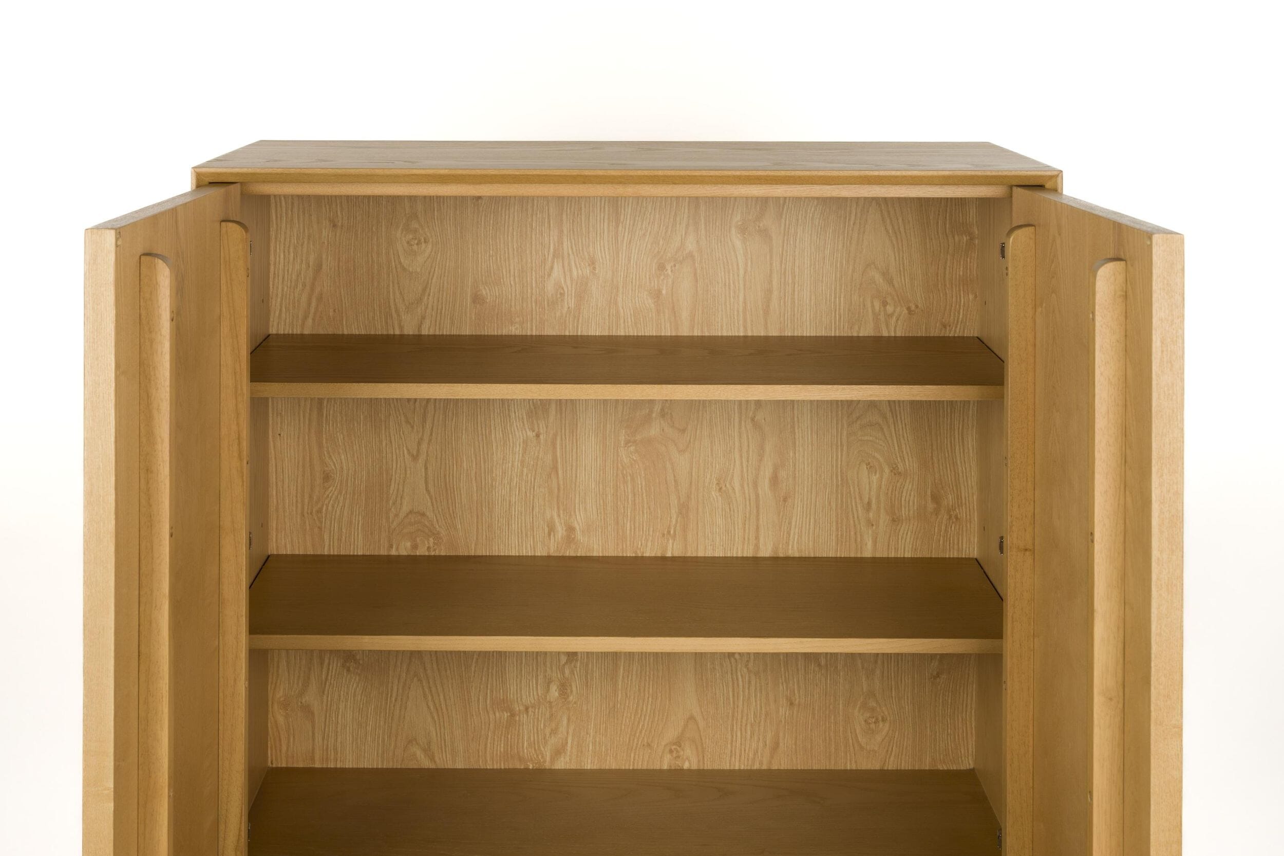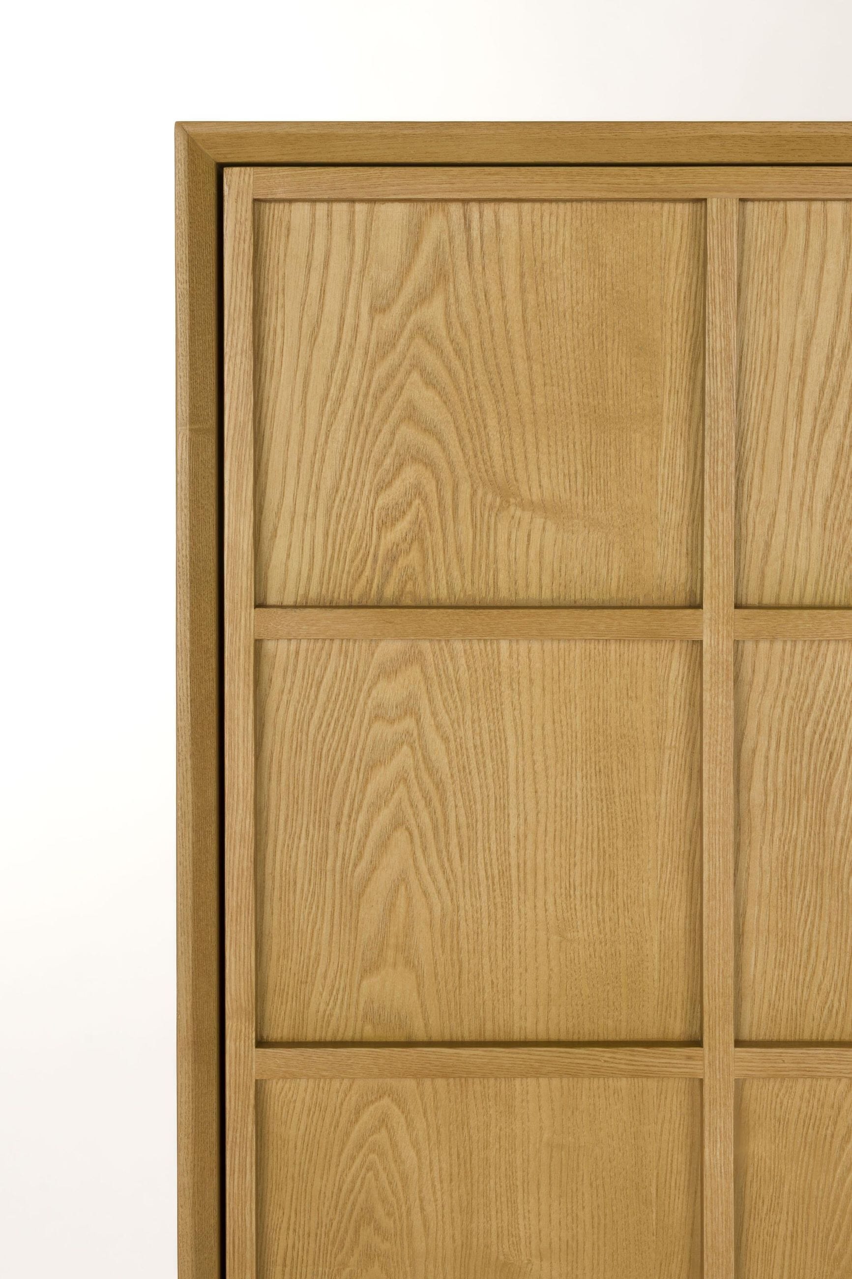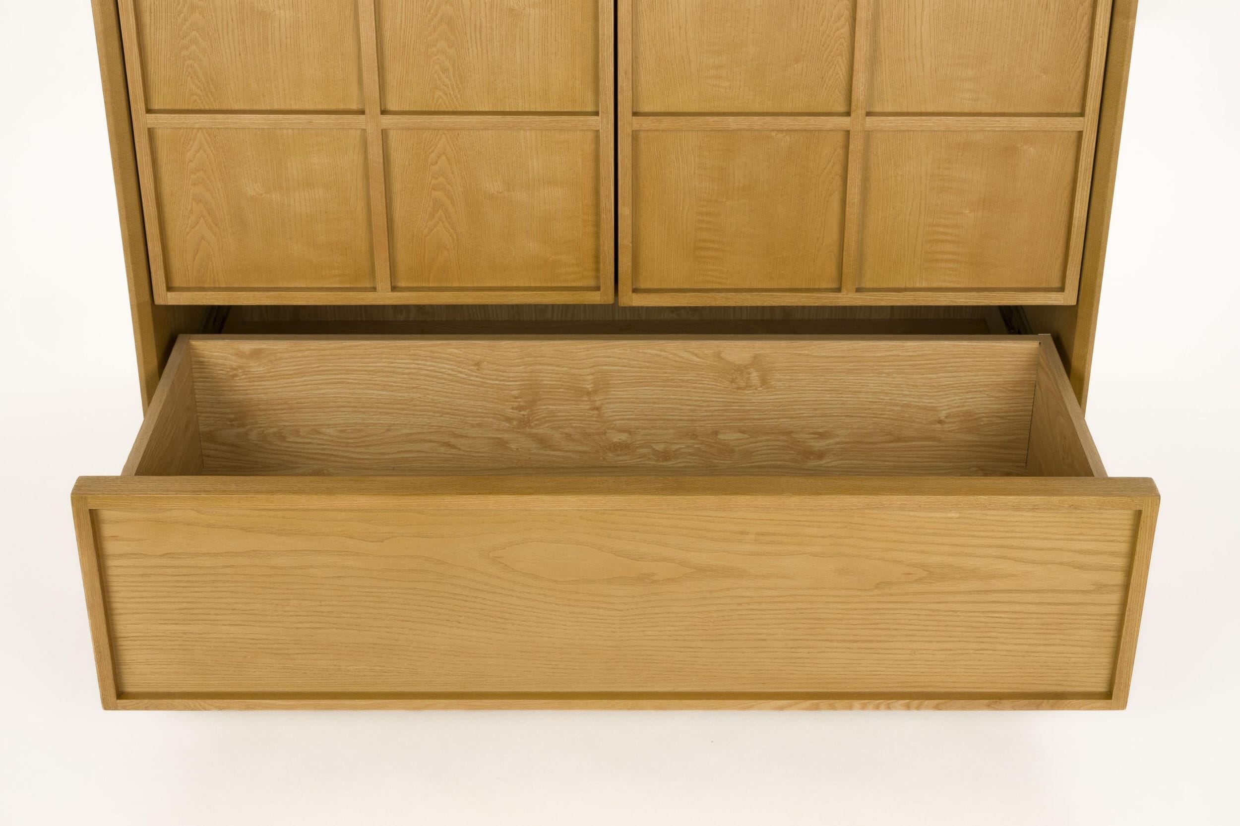 Die Kombination aus massiver Esche für das Gestell und hochwertigem Eschenfurnier für den Korpus sorgt für eine edle, natürliche Haptik. Besonders hervorzuheben ist die interne Schublade aus Gummibaumholz, die den hohen Qualitätsanspruch unterstreicht. Das präzise gefräste Raster der Türen ist nicht nur ein optisches Statement, sondern zeugt von handwerklicher Präzision auf höchstem Niveau.