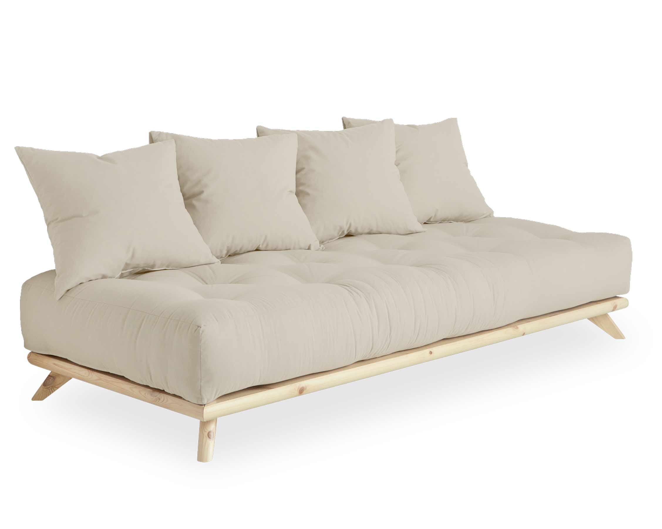 Das Sofa SENZA Daybed Kiefer natur wird mit gleich vier Kissen geliefert, tagsüber kann man die Kissen an der Wand platzieren und hat somit ein bequemes Sofa. Die können Sie arrangieren, wie Sie möchten, denn Sie können die Sitzfläche des Sofas auch als Bett benutzen. Etwa für Überraschungsgäste. Oder Sie bringen das maximal 250 kg tragende Sofa SENZA Daybed Kiefer natur in einem kleinen Wohn/Schlafraum zum Einsatz. Dieses Sofa passt wirklich in Ihr Leben.