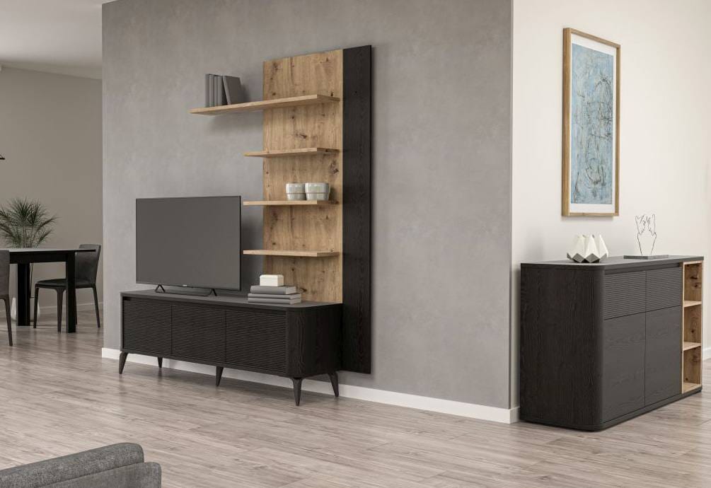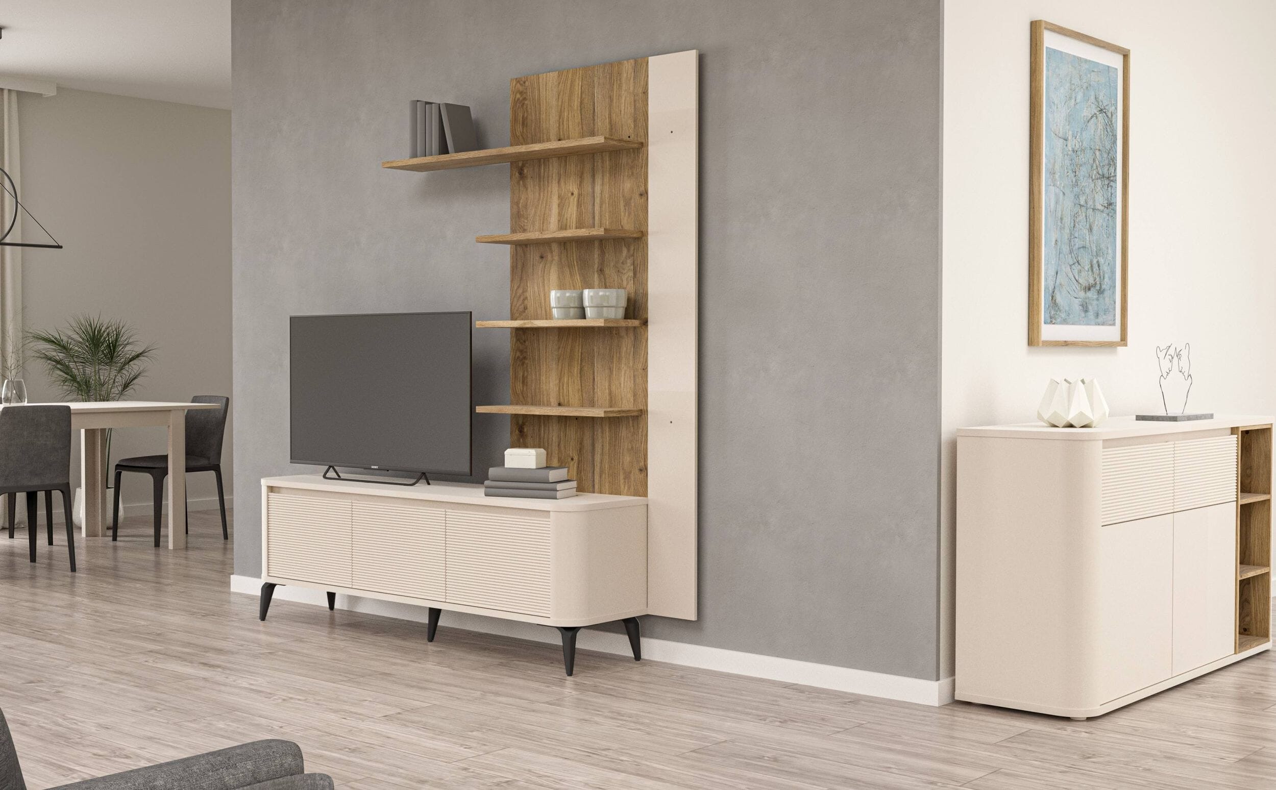 Hinter den drei Türen verstauen Sie alles, was Sie schnell zur Hand haben wollen. Soft-Close-Beschläge garantieren ein leises Schließen der Türen. Bei der Farbgebung haben Sie die Wahl. Mattes Terracotta oder Sand, kombiniert mit Mauvella Eiche oder dunkle Cabezone Eiche mit Artisan Eiche und Black Oak Front. So entstehen viele Kombinationsmöglichkeiten mit bestehenden Möbeln. Werten Sie Ihr Wohnzimmer gekonnt auf.