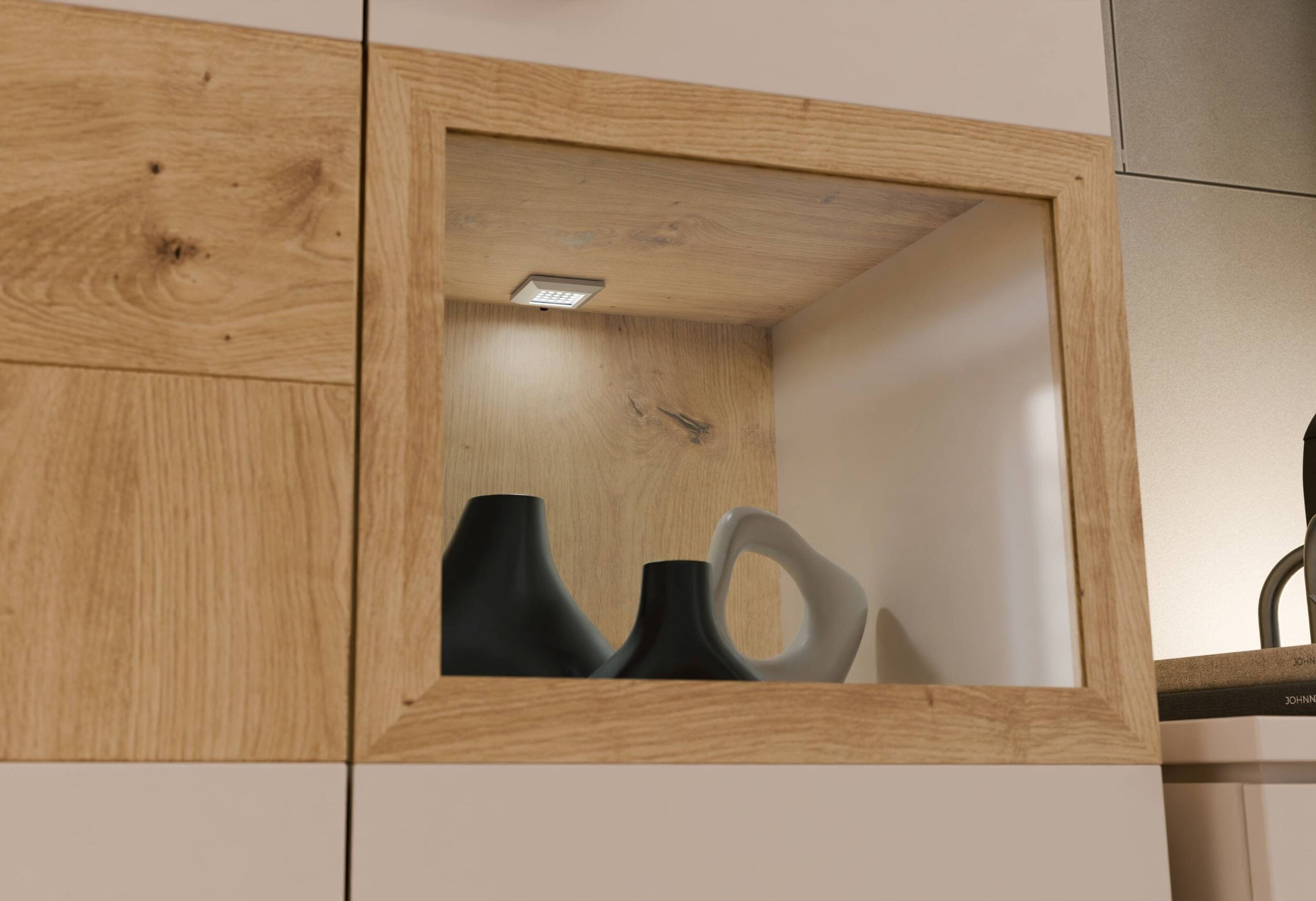 Skandinavisch reduziert und dennoch kein bisschen unterkühlt ist die dreiteilige Wohnwand LOUOTO, die zum Blickfang in Ihrem Wohnbereich wird. Vitrine, Lowboard und Wandregal sind aus stabiler Spanplatte gefertigt und für ihre extravagante Optik in sandfarbenen Dekor beschichtet. Absetzungen in Artisan Eiche frischen die helle Optik auf. Auch das Regalelement hat den naturnahem Eichenton. Aufgelockert wird die Kombination durch den Glaseinsatz der Vitrine. Dieser wirkt wie ein offenes Fach und bietet einen schönen Präsentationsraum an, der auch beleuchtet werden kann. Die möchliche Beleuchtung finden Sie als Zubehör.