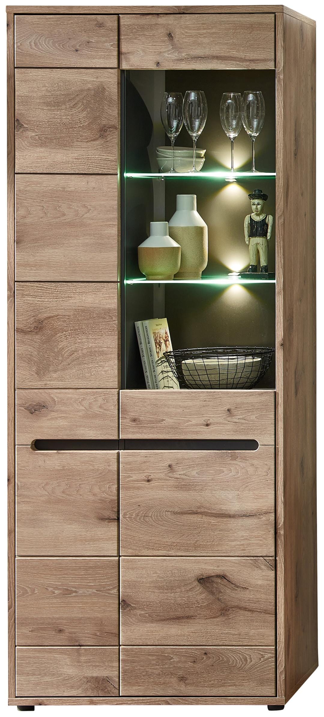 Das Erscheinungsbild ist geprägt von klaren Linien und einem raffinierten Dekormix in Viking Oak, Graphit und Glas. Die schicken Griffmulden und integrierten LED-Spots sind echte Gestaltungshighlights. In dem Lieferumfang der Fernsehwand sind nicht nur das TV-Board, sondern auch ein Vitrinenschrank und ein Wandregal enthalten.